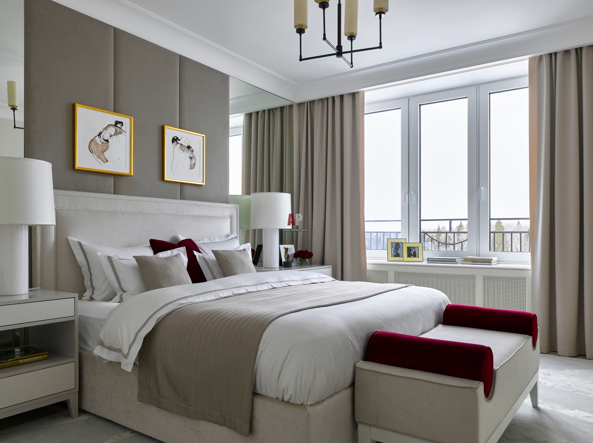 Главная спальня находится на первом этаже, она выполнена в жемчужно-серой гамме с брусничными акцентами. Кровать, банкетка, текстильная панель и прикроватные столики изготовлены на заказ. Люстра и настольные лампы, Visual Comfort & Co