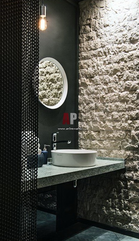 Стены в санузле облицованы белым камнем с брутальной фактурой.