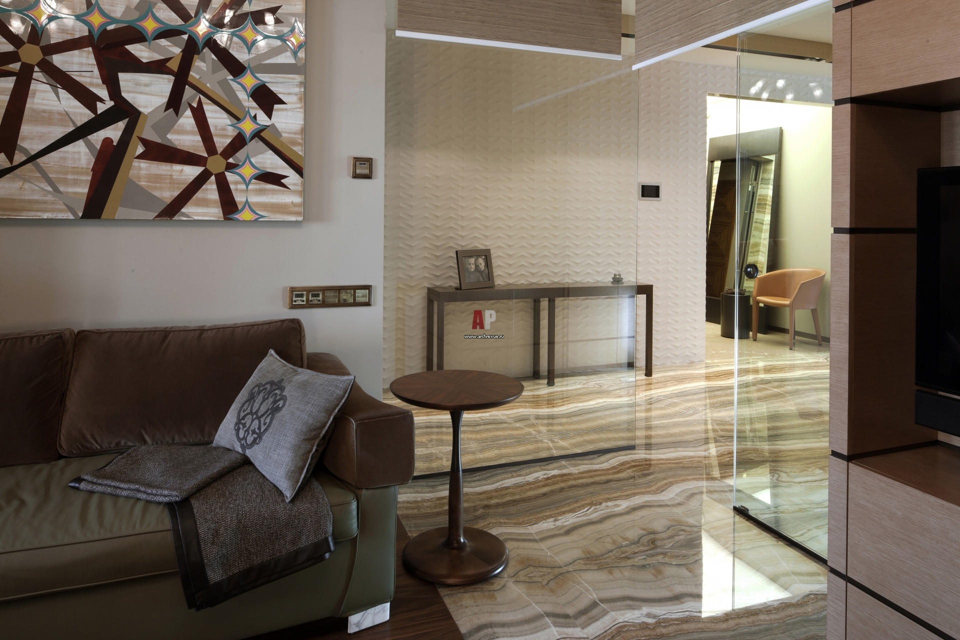 Вид из кабинета на холл через стеклянную перегородку. Пол из оникса «заходит» в объем кабинета. Этот прием объединяет разные по назначению помещения. Картина, автор – Альфонсо С. Собрино.