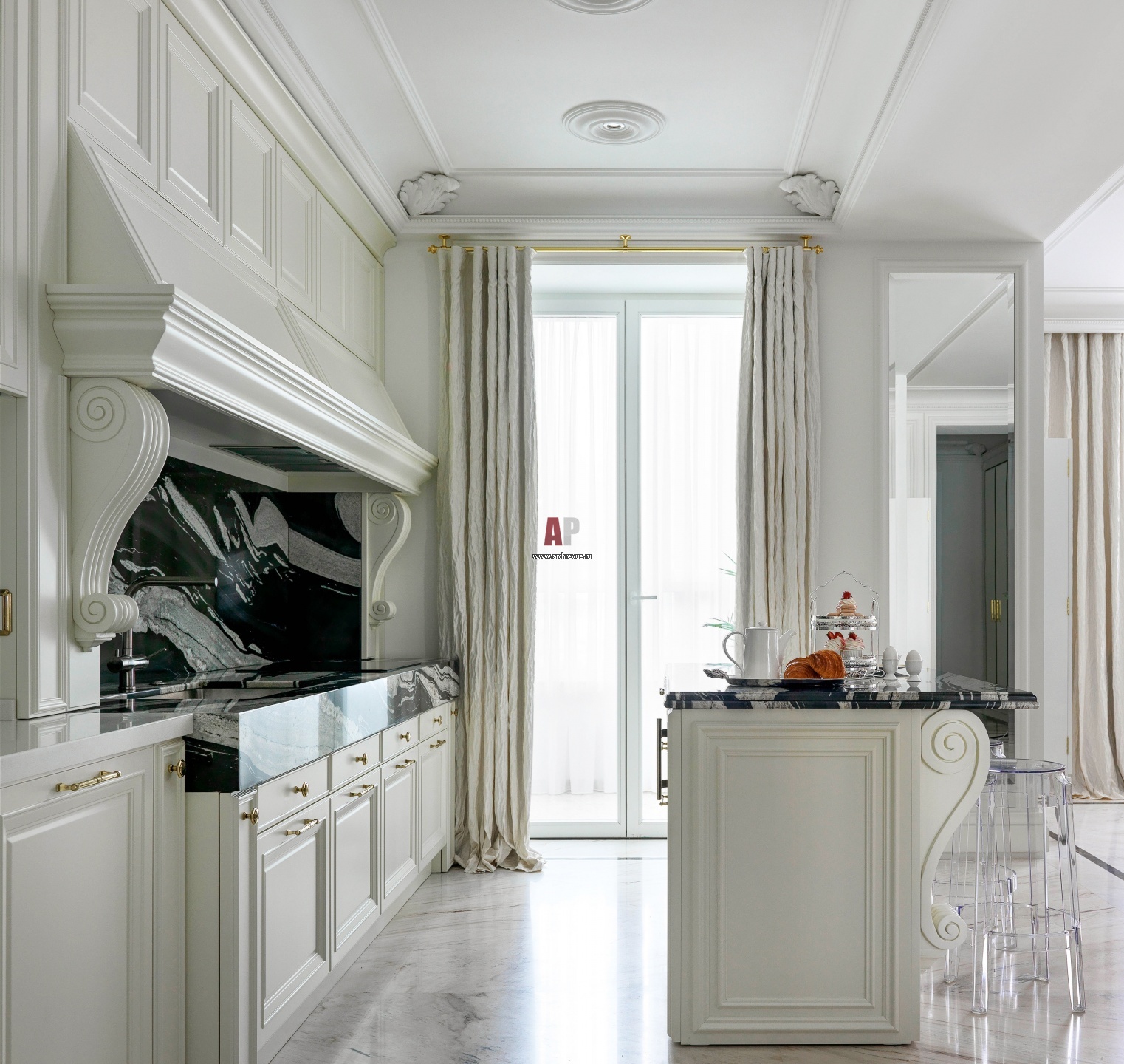 Пол в зоне кухни-гостиной выложен светлым мрамором Palissandro Classico. Вставка на стене, кухонный фартук, столешница барной стойки сделаны из черного гранита Copacabana с живописными прожилками. Кухня, Castagna Cucine. Прозрачные пластиковые табуреты, Kartell.