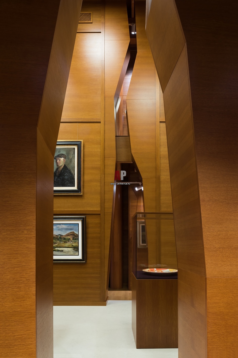 Под обширную хозяйскую коллекцию фарфора отведен отдельный блок в гостевом доме. Деревянные витрины для размещения предметов искусства из хозяйской коллекции выполнена под проект. Интерьер частной галереи в загородной усадьбе.