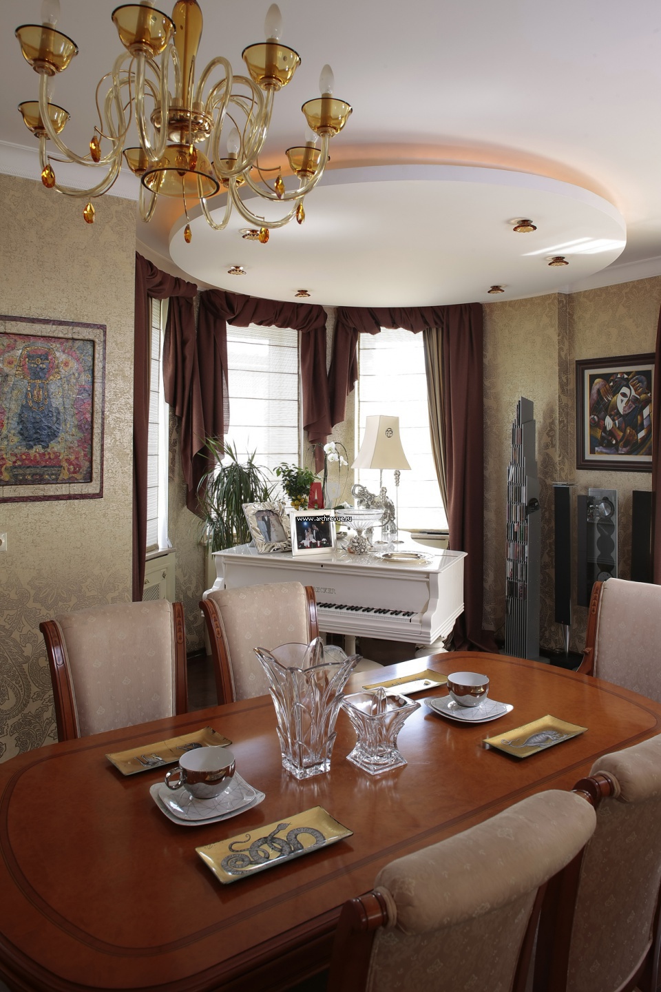 В эркере, акцентированном круглым подвесным потолком, находится зона музыкальной гостиной с белым роялем.