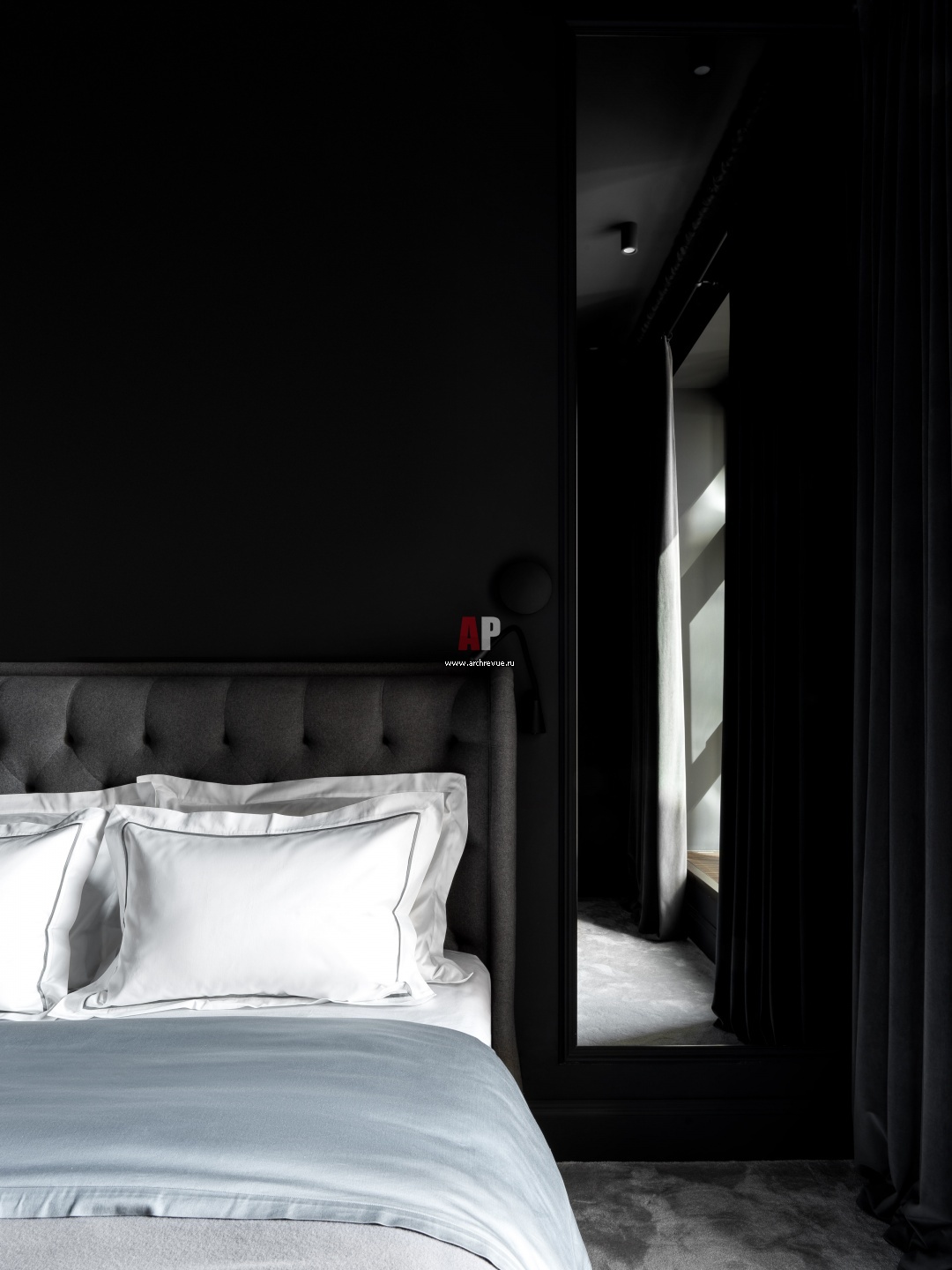 Белая классическая квартира с черной спальней. Интерьер спальни родителей.
