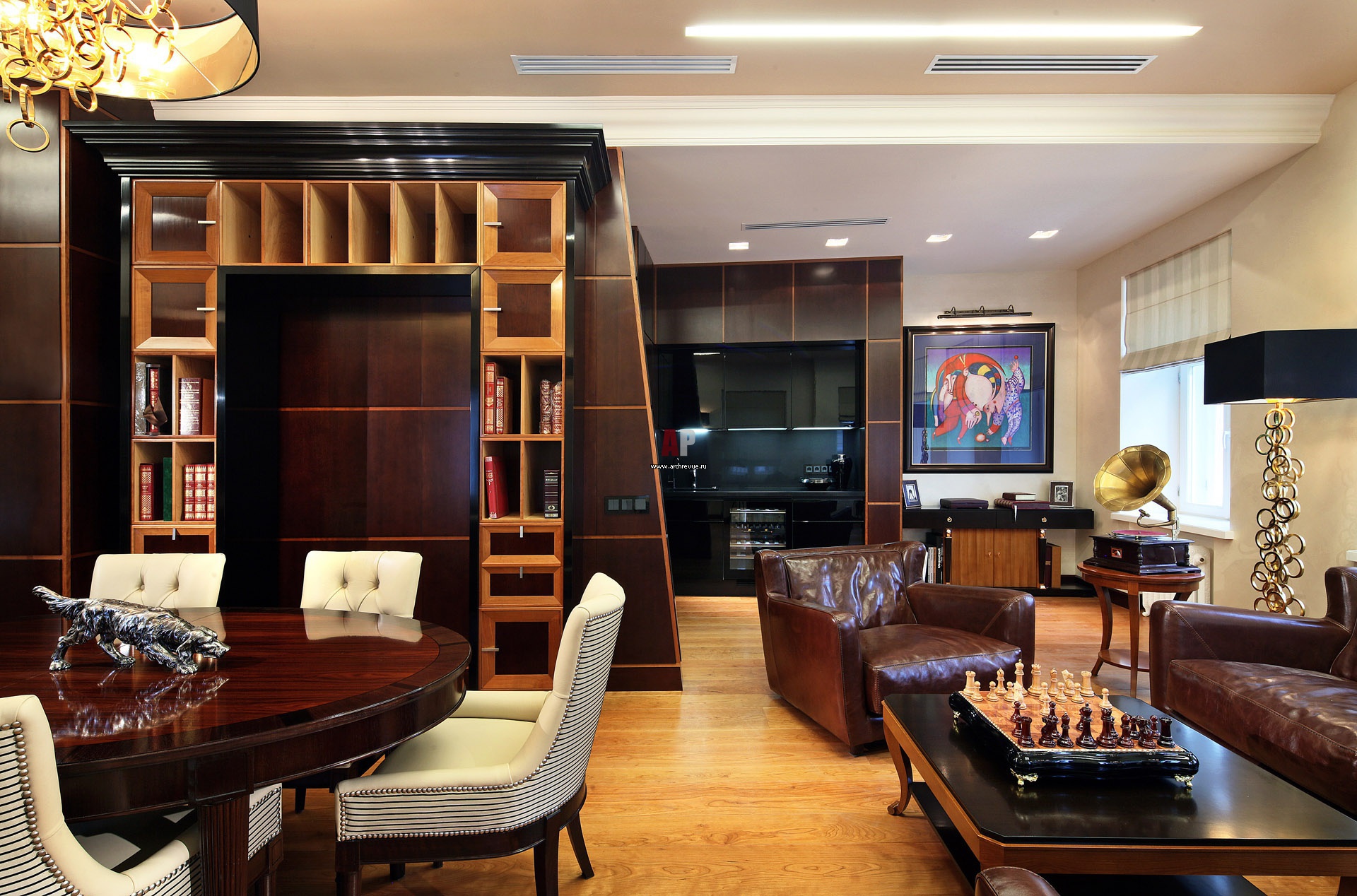 Переговорная зона в стиле ар-деко. Со стороны переговорной перегородка неправильную форму. По центру сложное геометрической композиции - декоративный портал, где размещены книги. Переговорный стол, стулья, Selva.
