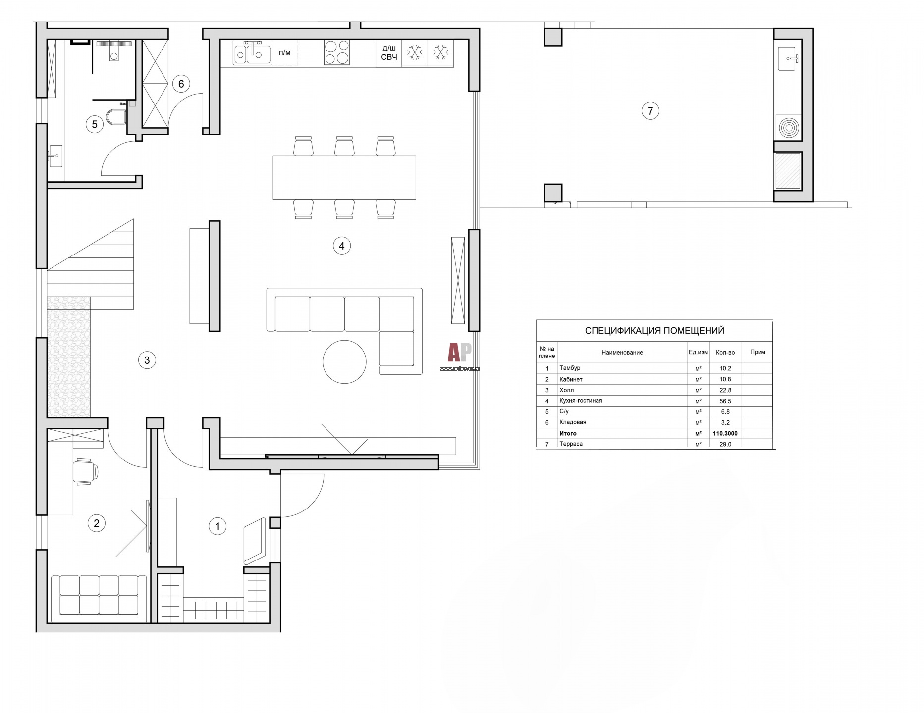 План первого этажа двухэтажного современного дома на берегу озера в Ростовской области. Общая площадь – 260 кв. м.