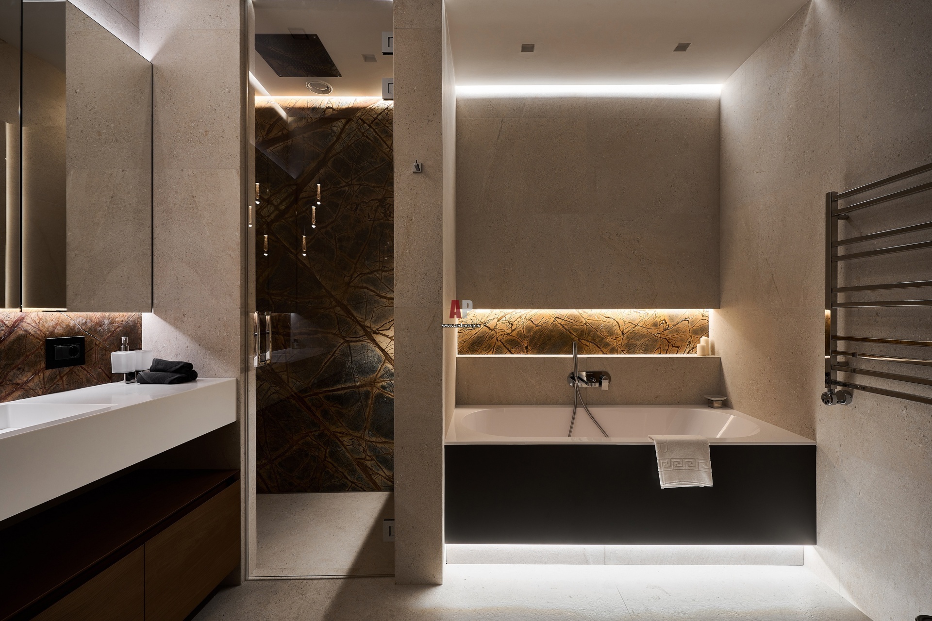 Мастер-ванная. В отделке использован керамогранит под травертин и натуральный акцентный мрамор.