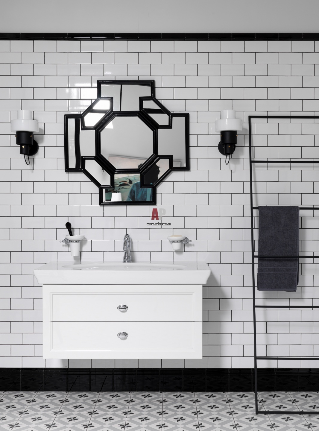 Дом с элементами ретро для отдыха в Подмосковье. Санузел в мансарде. Зона умывальника. Зеркало, Eichholtz. Мебель и раковина, Villeroy & Boch.