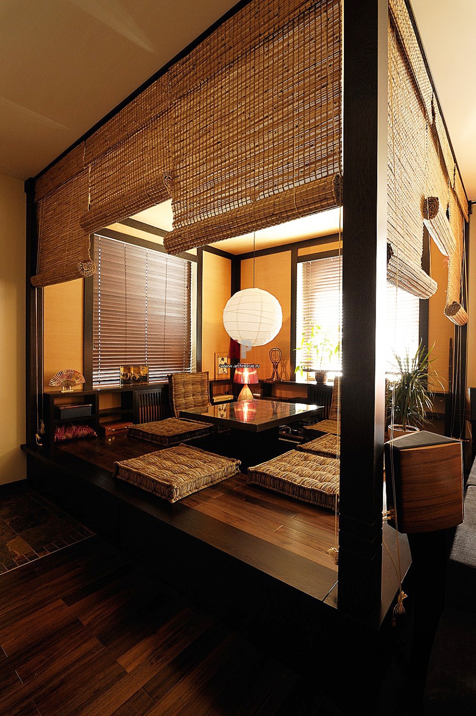 Доминанта общей зоны – японская чайная на подиуме. Конструкция из темного дерева высотой 45 см и размером 3,5Х3,5 метра с несущими вертикальными балками оформлена рулонными шторами, которые позволяют обособить зону.
