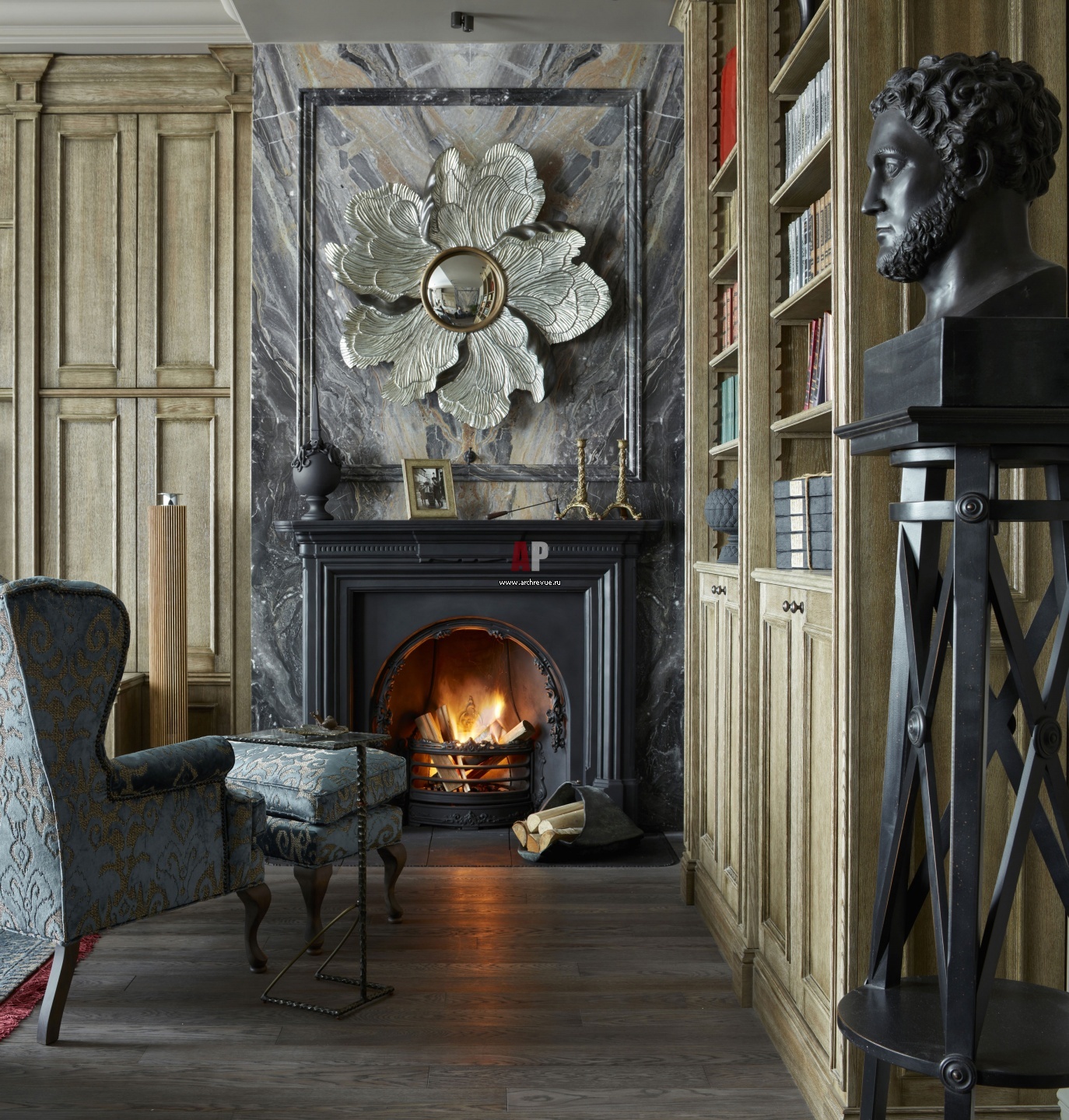 Зона камина в классическом стиле. Чугунная топка камина обрамлена черным лепным порталом, дымоход зашит серым камнем. Зеркало, Baker.