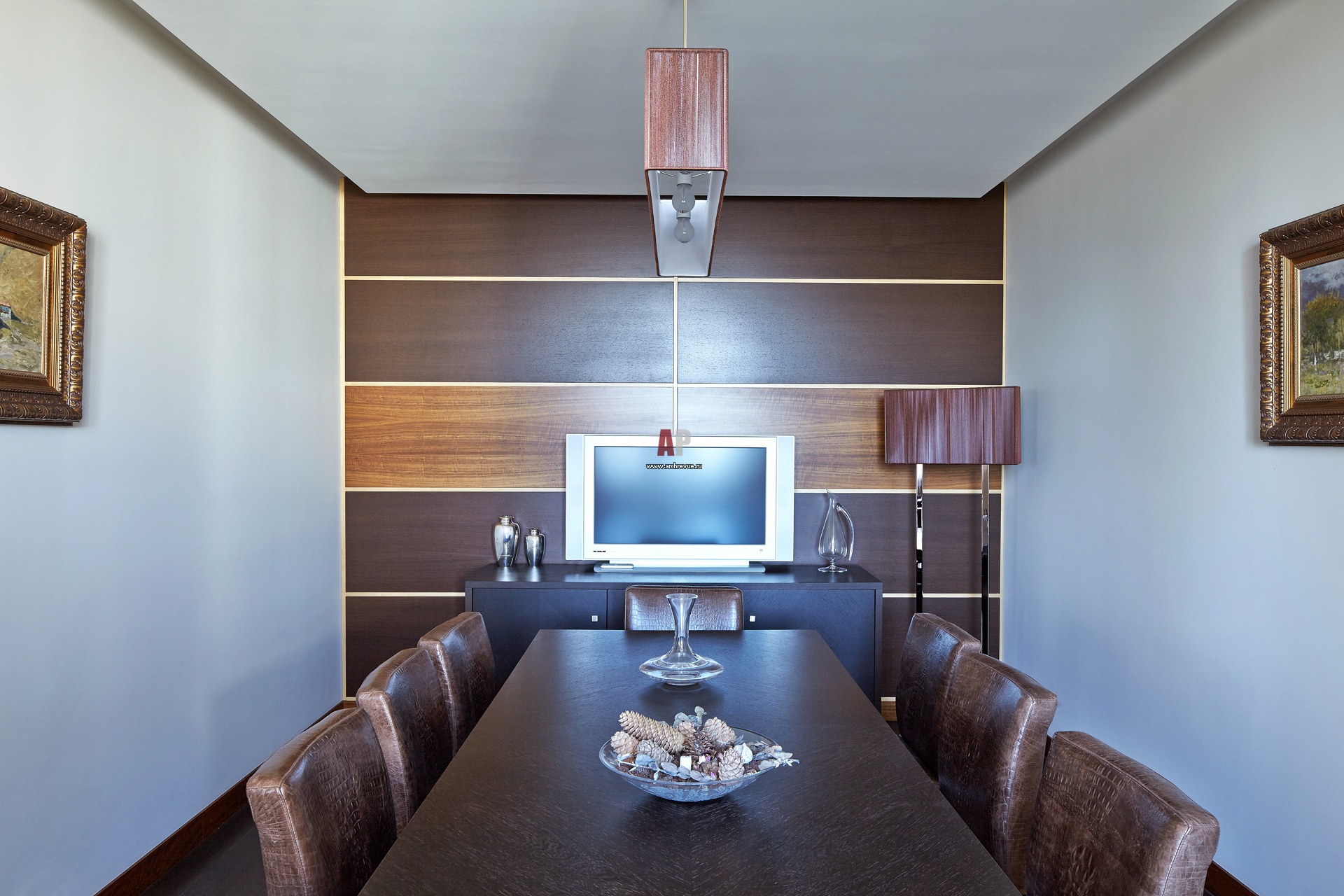 В интерьере современной столовой угадываются мотивы ар-деко. Этому служат стулья из с обивкой из фактурной кожи Smania и светильники с прямоугольными абажурами и фурнитурой из латуни. Торцевая стена зашита горизонтальными панелями из дуба и ореха.