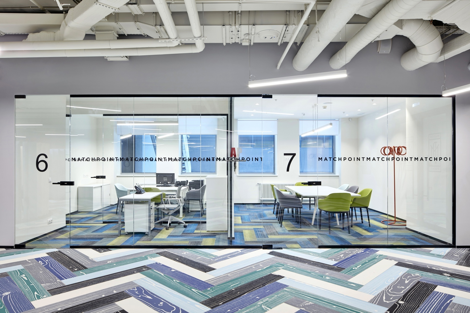 Сине-серый керамогранит общей зоны в стеклянных сейлс-зонах и переговорных сменяет ковровая плитка в сходной цветовой гамме.