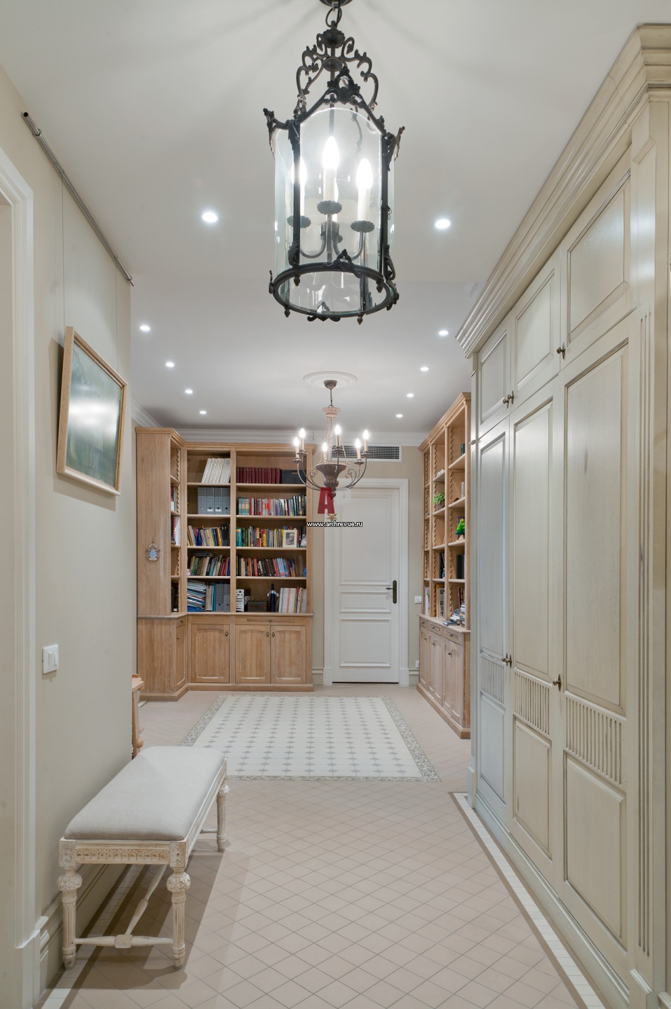 Интерьер прихожей. В просторном холле декоратор разместила книжные стеллажи. На полу – панно из керамической плитки с узорчатым бордюром, поставщик «Грета Вульф».