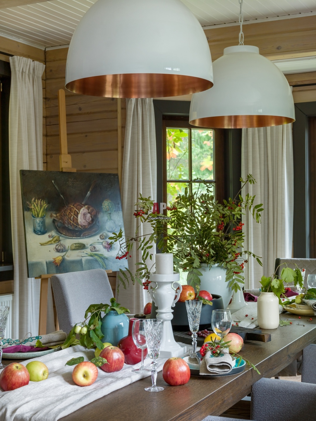 В интерьере столовой заметены черты скандинавского стиля и кантри.