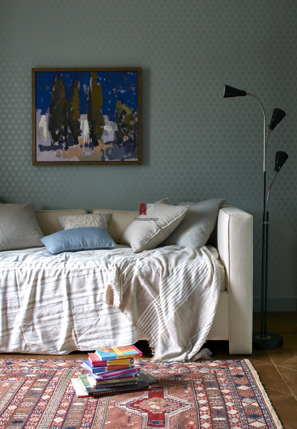 Интерьер кабинета в голубых тонах. На полу – дагестанский килим. На диване Hickory Chair – светлое льняное покрыло.
