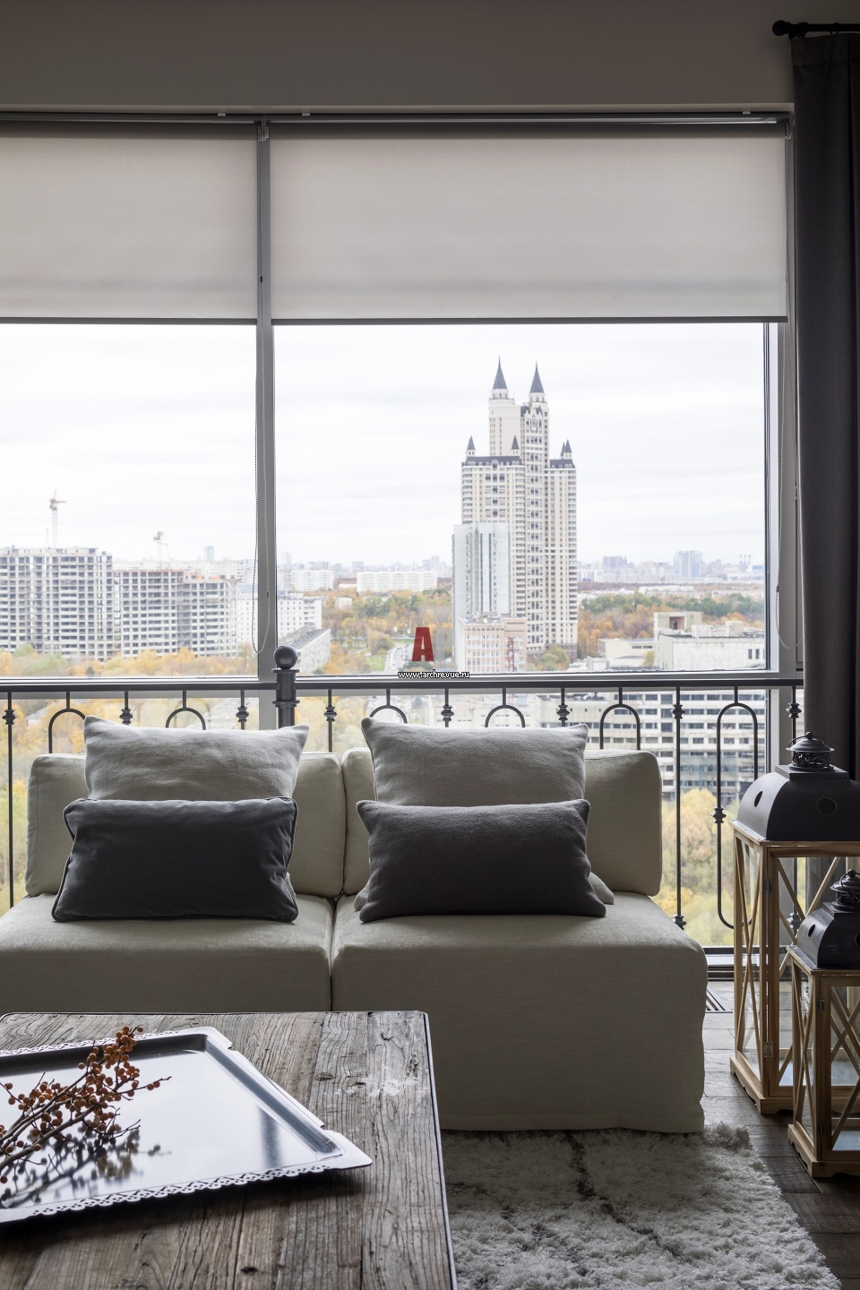 Интерьер гостиной в серо-коричневых, «грибных» тонах. Стены во всех помещениях выкрашены в единый цвет, что дает иллюзию пространства без явных границ: этот прием подчеркивает большой объем квартиры.