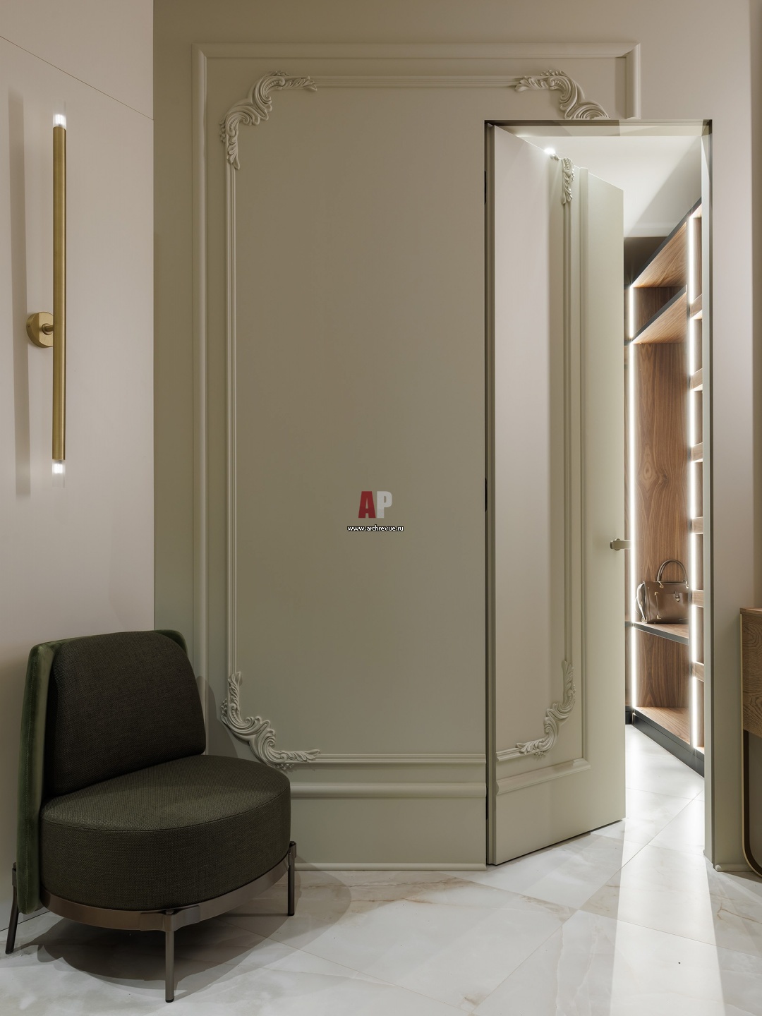 Современная классическая квартира с молдингами и гипсовой лепниной. На стенах – краска сложного пастельного оттенка: бежевого с добавлением оливкового.