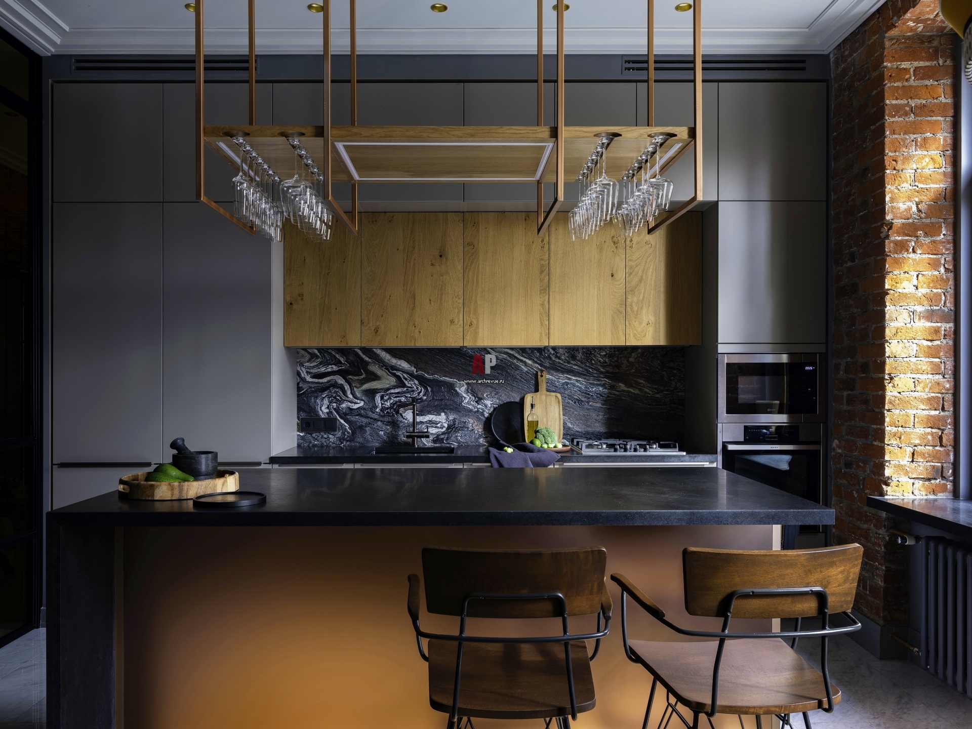 Зона кухни в гостиной. Встроенная кухня, Beckermann. Полка над островом сделана на заказ по эскизам архитектора. Барные стулья, Crate and Barrel. Фартук – мрамор, Chipolino Multicolor.