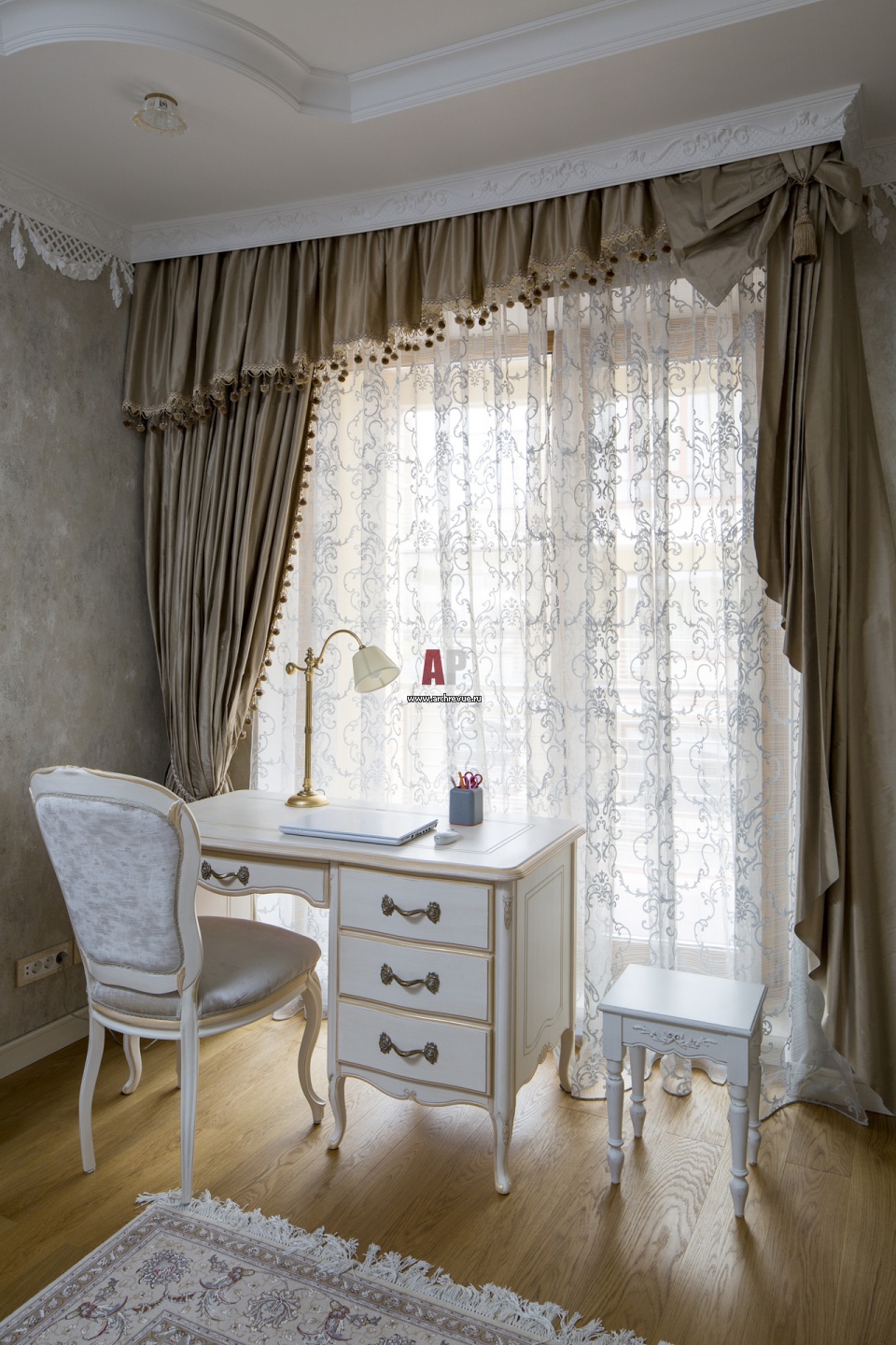 Письменный стол в детской комнате расположен возле окна. Мебель от Savio Firmino под белой эмалью контрастирует с портьерами из коричнево-серого шелка. Ассиметричная текстильная композиция украшена пышным бантом.