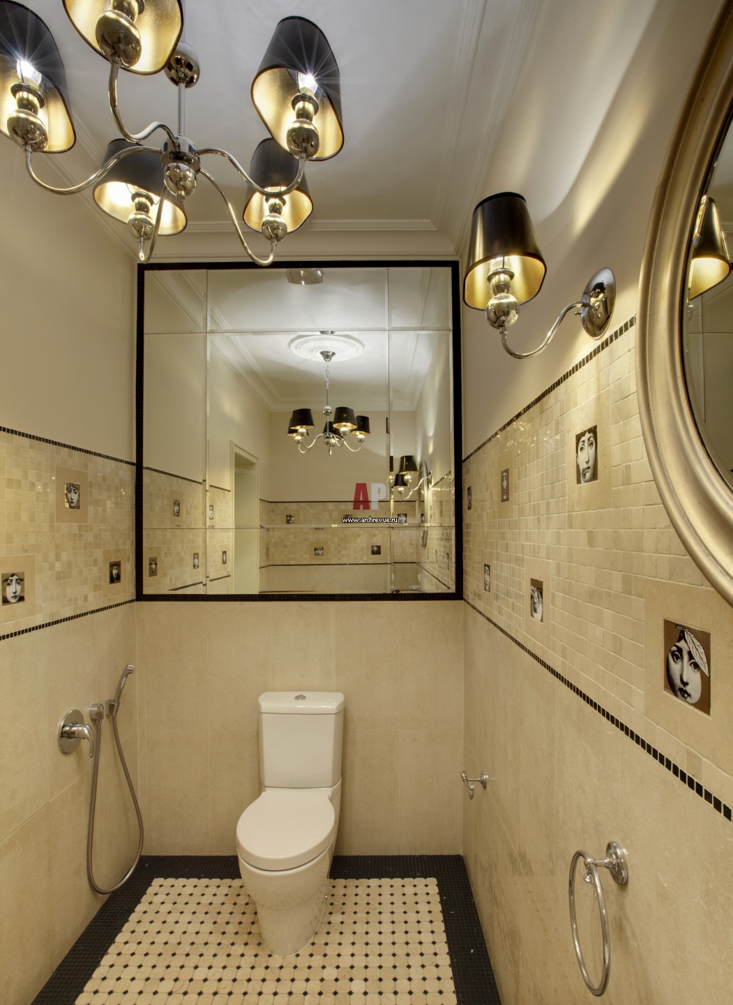 Интерьер гостевого санузла исполнен в стиле современная классика. Со светлыми стенами контрастируют люстра и бра с черными абажурами.