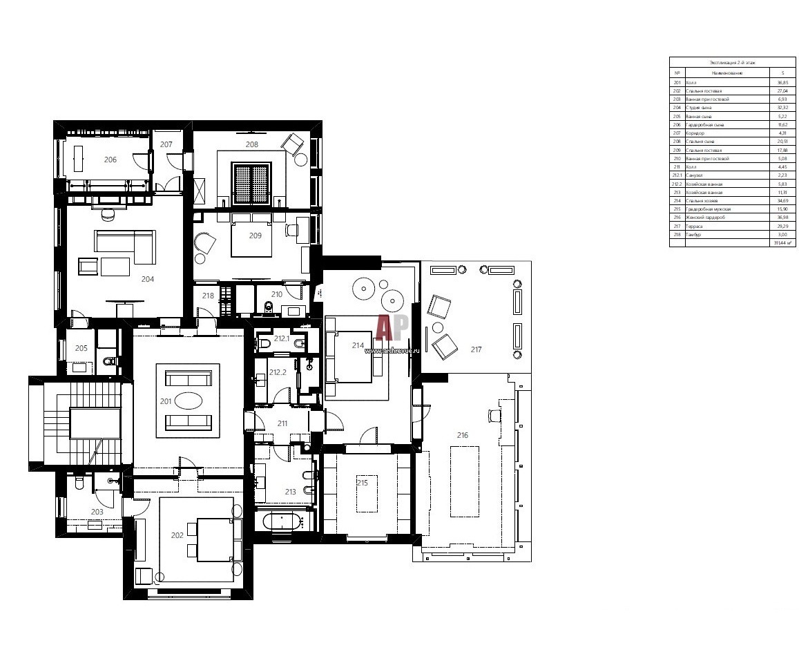 План второго этажа трехэтажного дома в поселке Малаховка. Общая площадь: 752 кв. м.