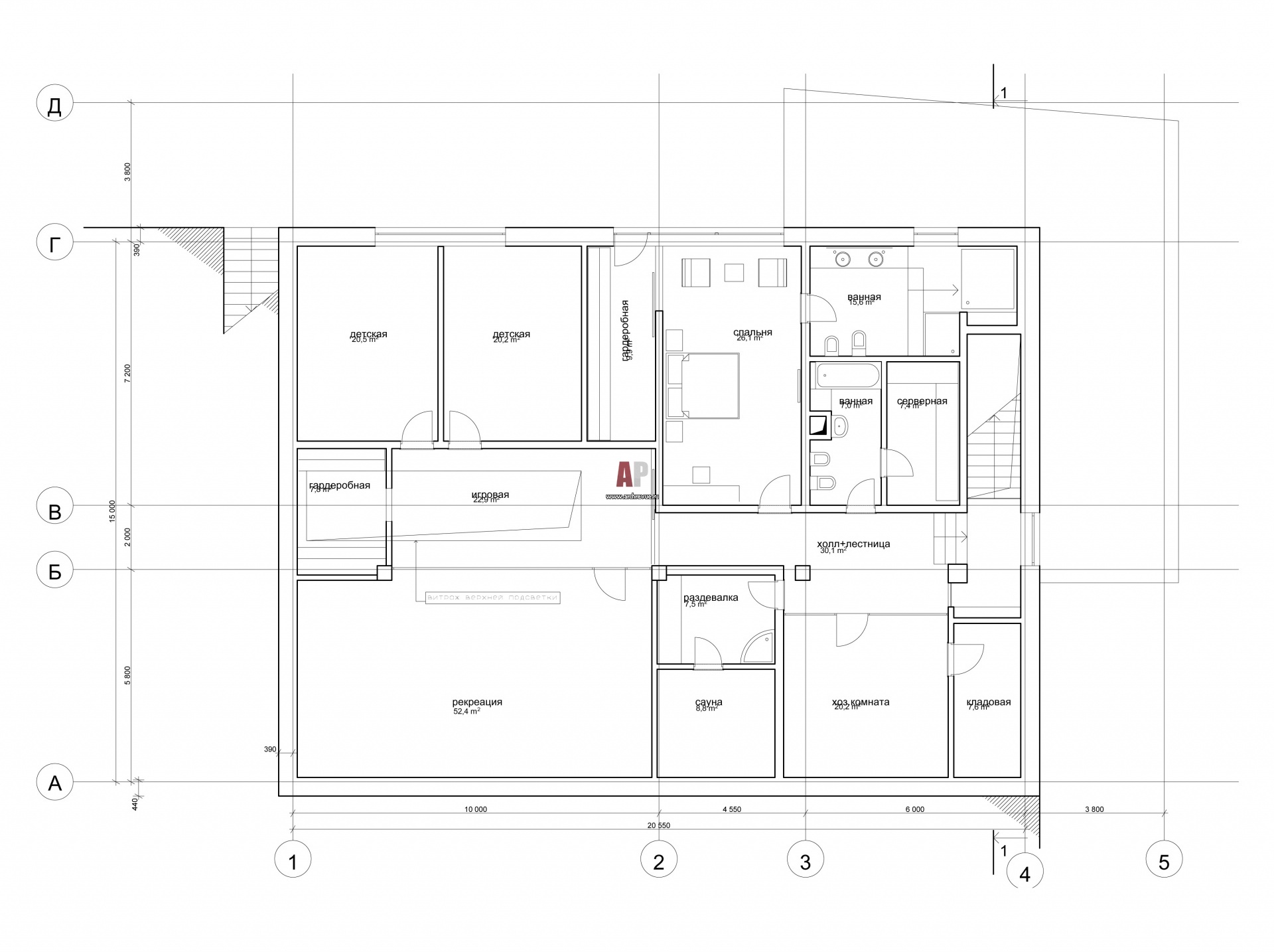 План первого этажа двухэтажного дома с холме. Общая площадь - 450, 3 кв. м.