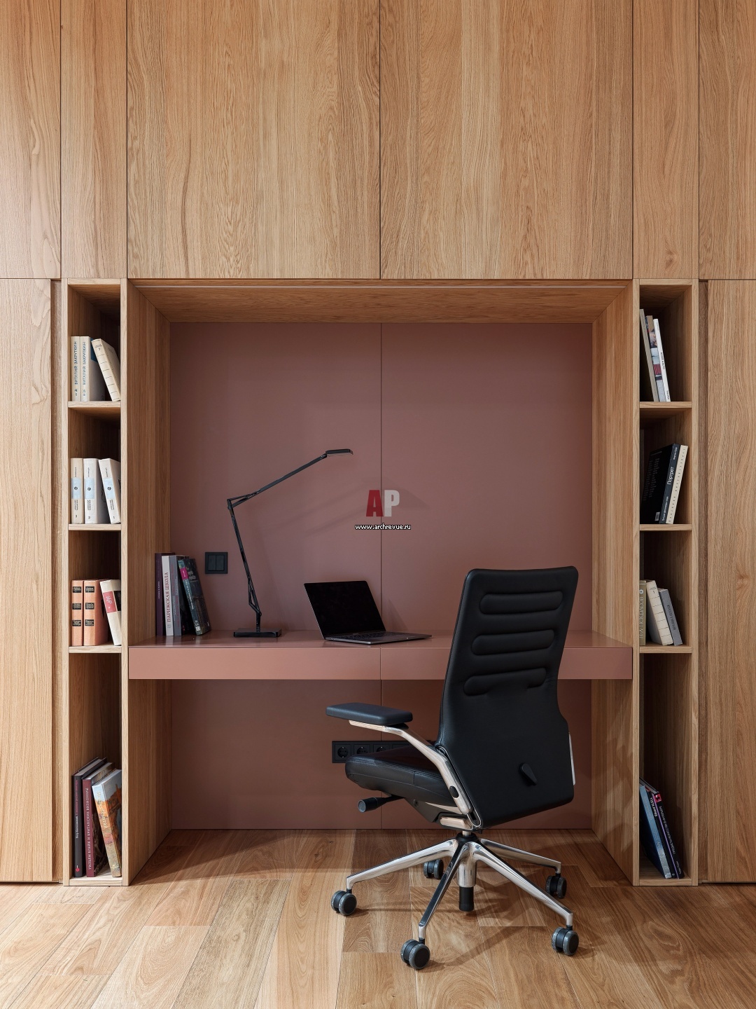 Зона кабинета на втором этаже. Столярные изделия из дерева с природной фактурой сделаны на заказ. Рабочее кресло, Vitra, модель AC 5 Work. Настольный светильник, Flos