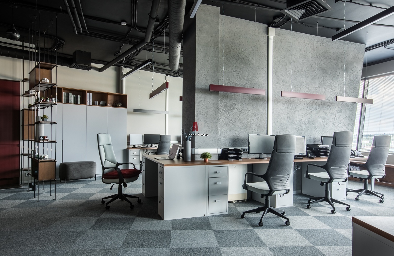 Рабочая зона. Все столы для 50 сотрудников выполнены на заказ под размеры. Фасады – МДФ с эмалью; столешницы из шпона дуба – изготовление Bionica Wood.