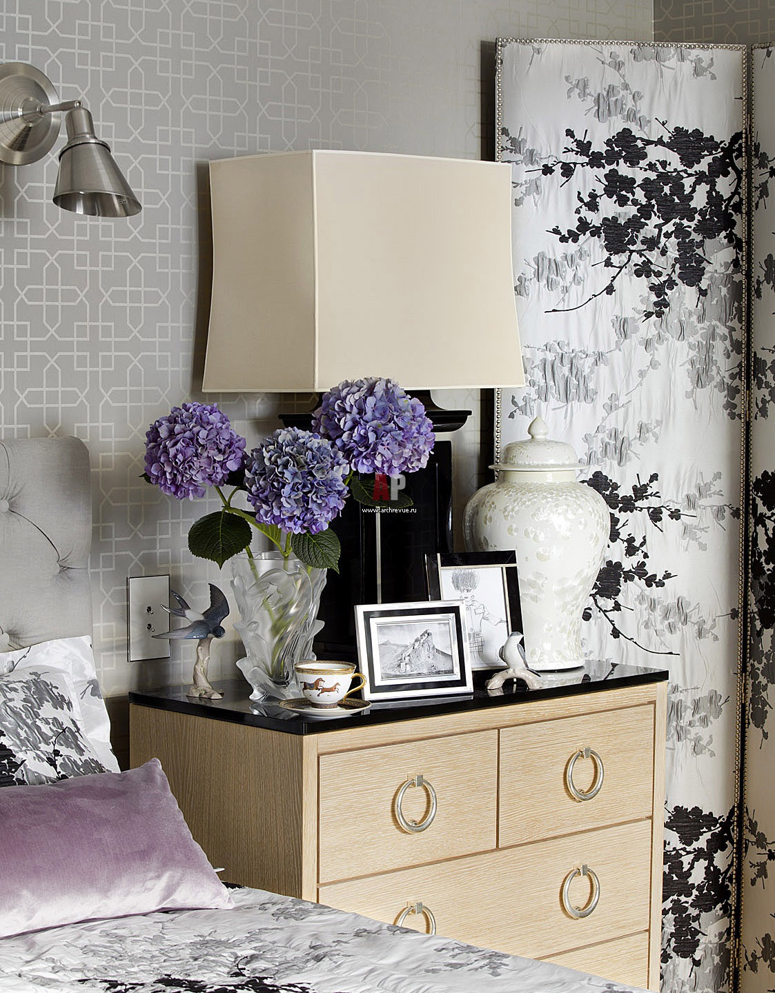 Фото интерьера спальни в жемчужных тонах в стиле декаданса.