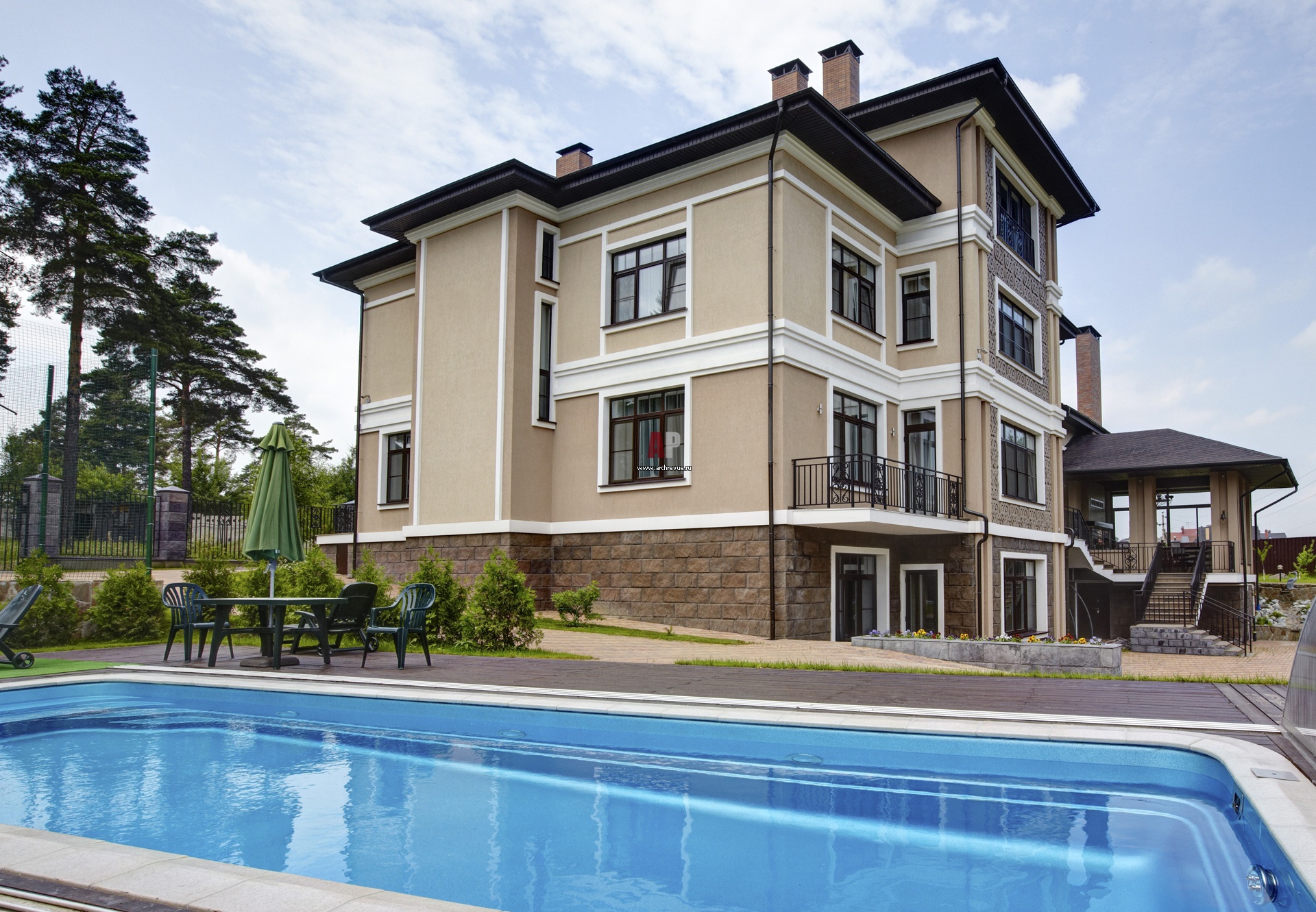 Фасад современного дома с открытым бассейном на участке. По периметру уличного бассейна – камень и тиковый настил.