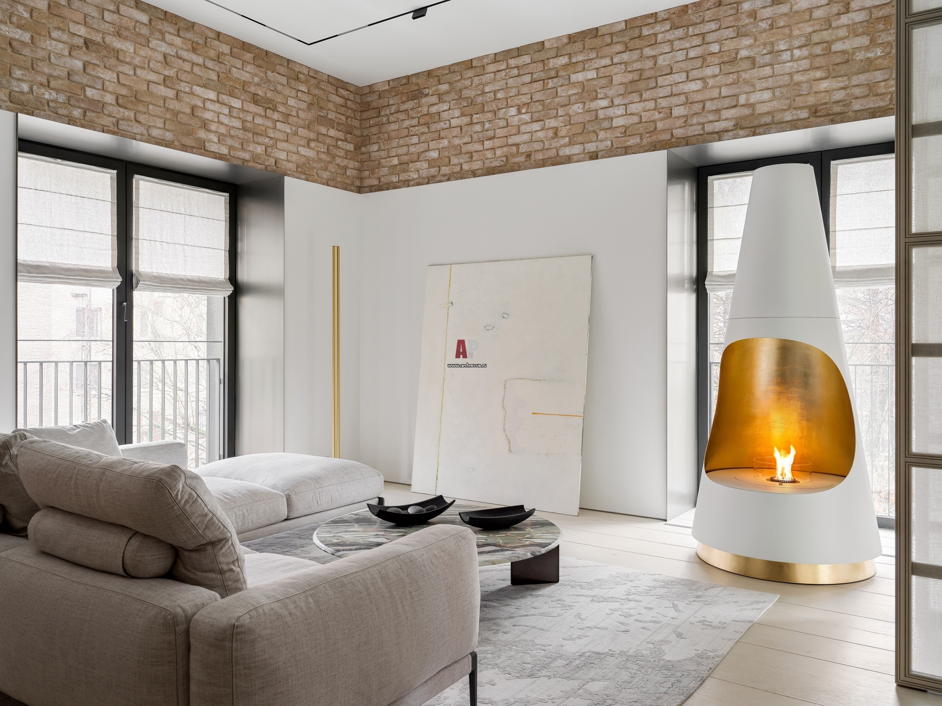 Гостиная. Диван, Flexform, модель Romeo. Столик журнальный, Minotti, модель Keel. Торшер, Flos, модель Coordinates F. Камин, Flambis, модель Glammfire Archimedes. Встроенные трековые светильники, Eden Design. Картина Эдуарда Гонтаря «Молоко».