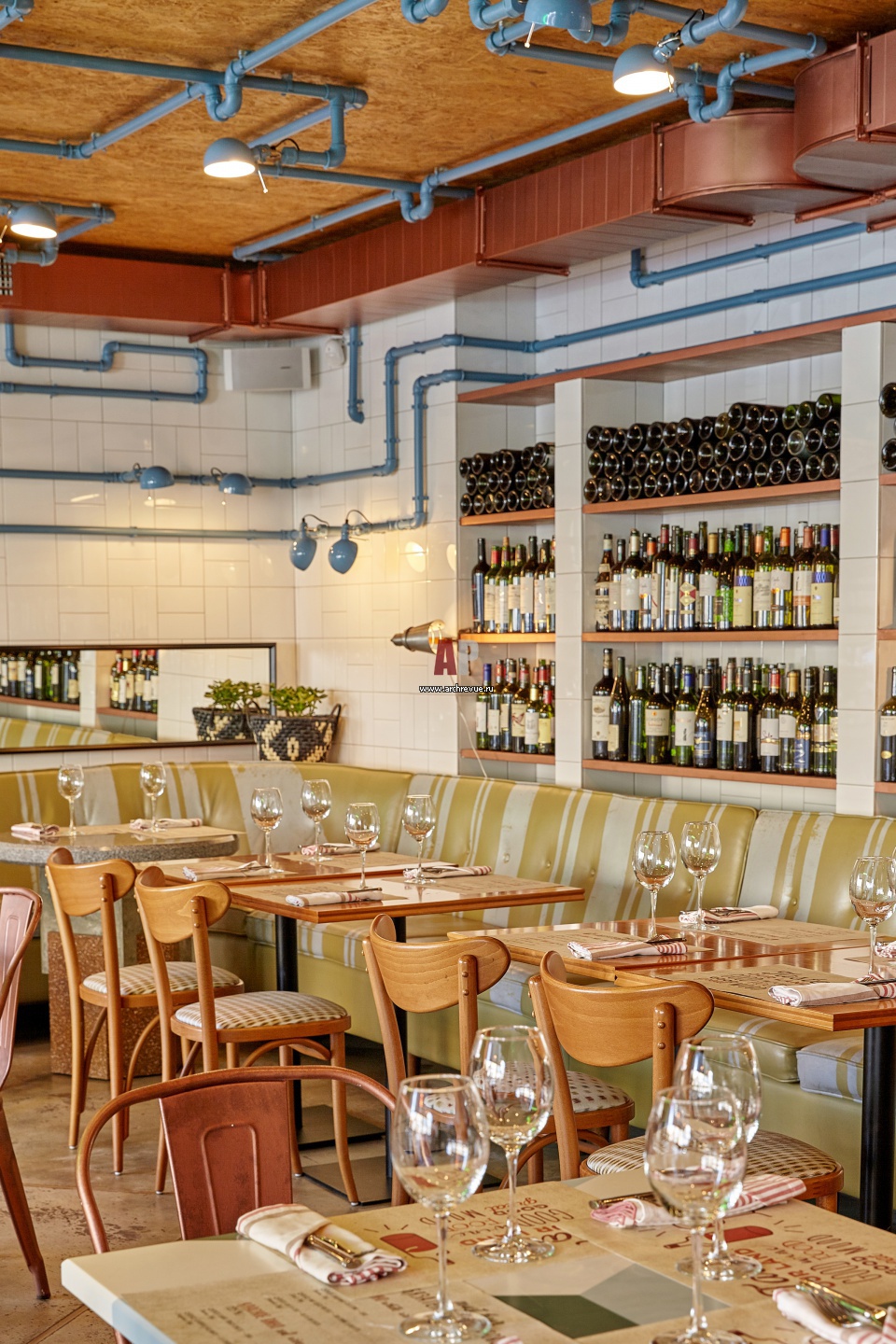 Стены одного из залов облицованы белой керамической плиткой. Под потолком и вдоль верха стен – сложная конструкция из водопроводных труб. Потолок отделан ОSB-панелями под лаком.