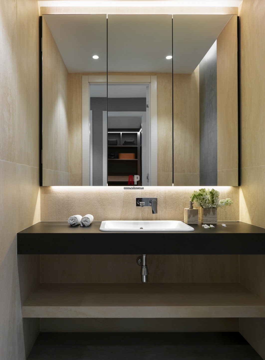 Гостевой санузел выполнен в современном стиле. Подстолье сделано из темного дерева. Зеркальный шкаф занимает всю ширину ниши для умывальника. Раковина, Villeroy & Boch. Смеситель, Hansgrohe.