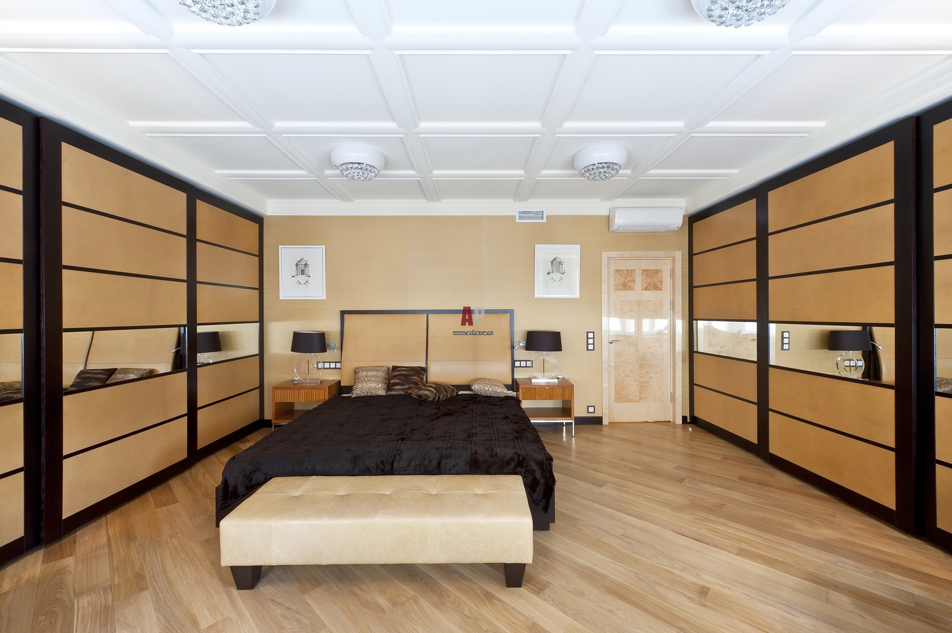 В оформлении помещений автор вдохновлялась эстетикой дорогих яхт. Встроенные шкафы обиты кожаными панелями. Горизонтальная рассечка темным деревом визуально увеличивает помещение.