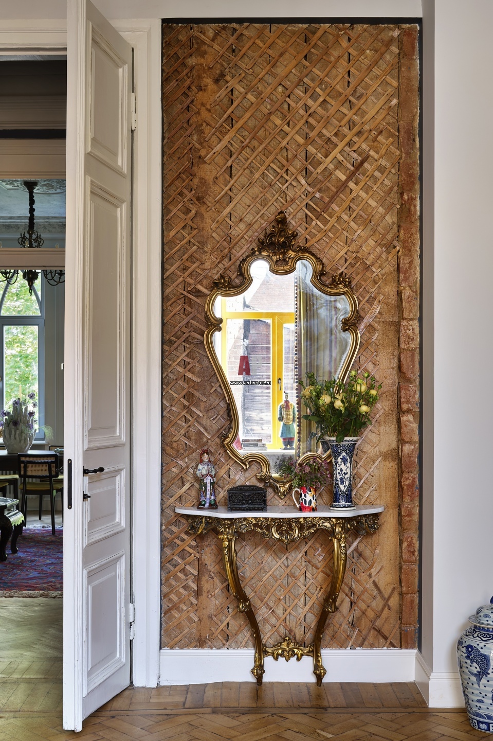 При входе в кабинет дизайнер сохранила дранку, она подчеркнула ее красивый рисунок лаком и сделала его контрастным фоном для барочной консоли с зеркалом.