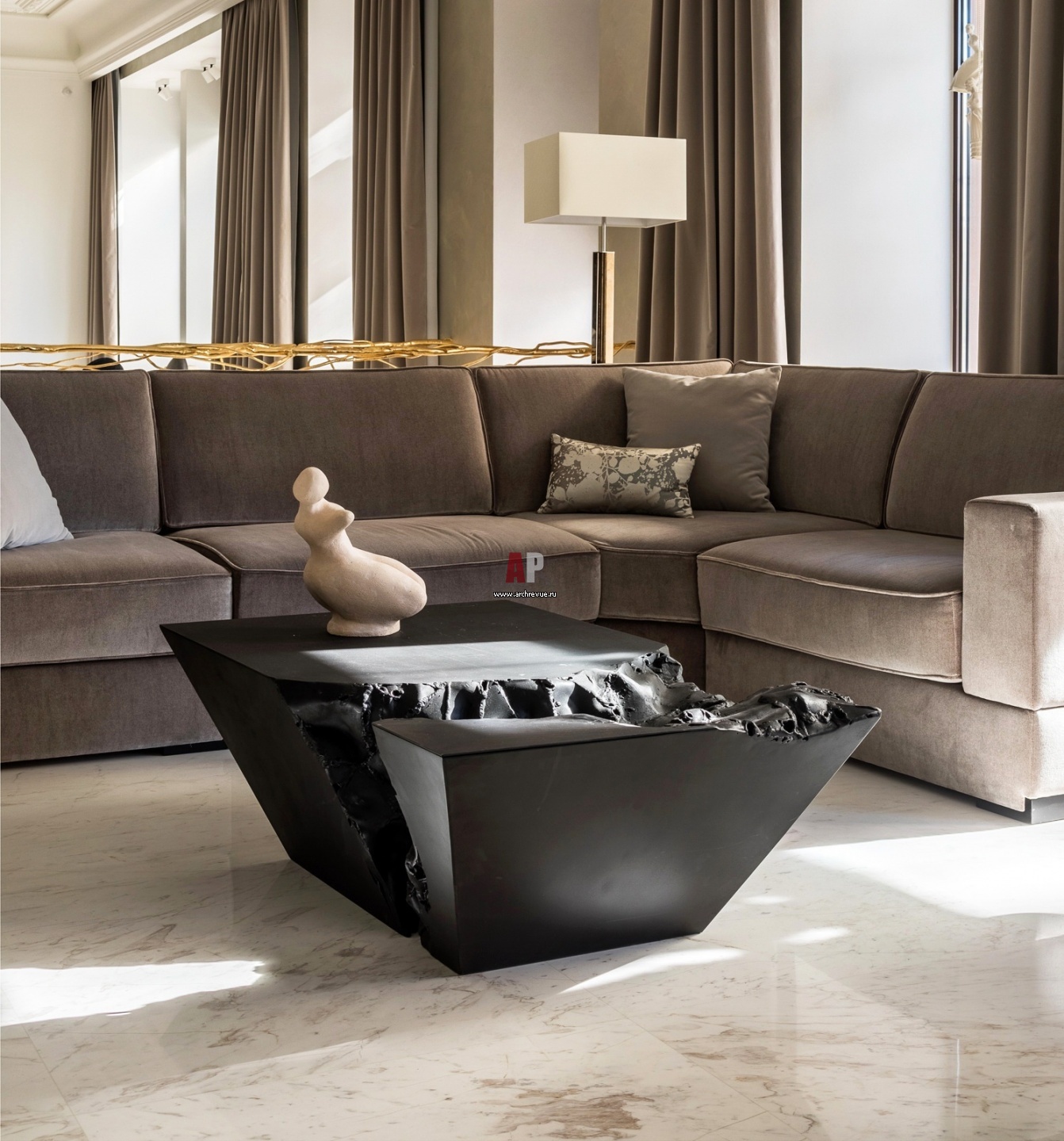 Фрагмент гостиной. Диваны Donghia в обивке тканью Rubelli кофейного цвета. Журнальный стол «Каньон» из черного металла работы скульптора Матвея Корочкина.