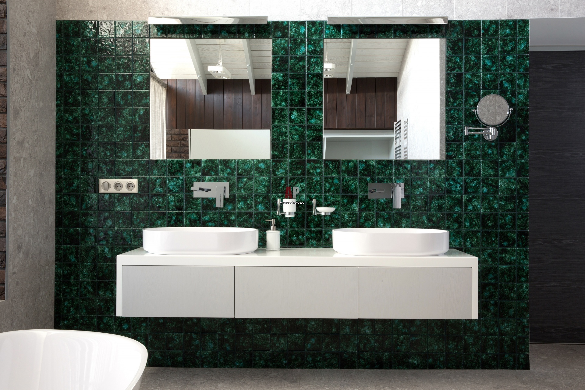 Интерьер большой ванной комнаты (площадью 30 кв. м) на втором этаже. На фоне нейтральной отделки стен и полов эффектно выглядит стена насыщенного изумрудно-зеленого цвета с умывальниками.