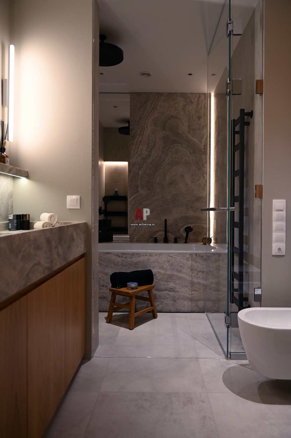 Ванная комната отделана роскошным серебристым травертином Сильвер Фантастик в обработке антик, который имеет очень редкий для этого камня рисунок слоев. К нему по оттенку идеально подходит плитка из коллекции Миллениум, ItalON.