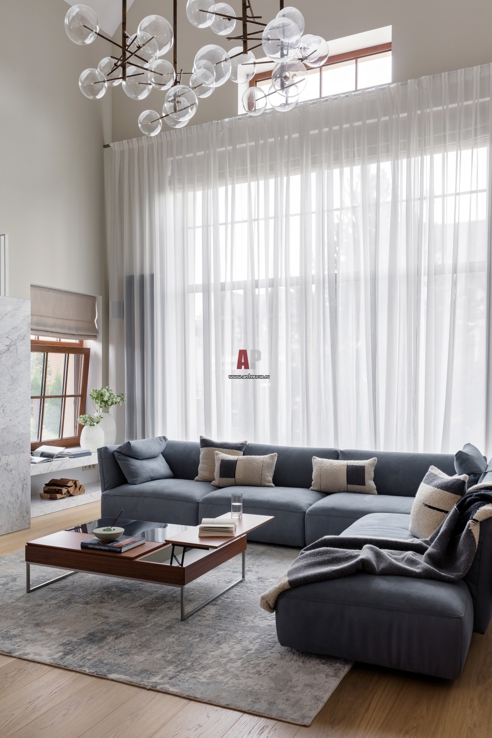 Современный светлый дом с рациональной архитектурой. На полу – крупноформатный паркет из массива светлого дуба. Потолочный светильник, Gallotti & Radice.