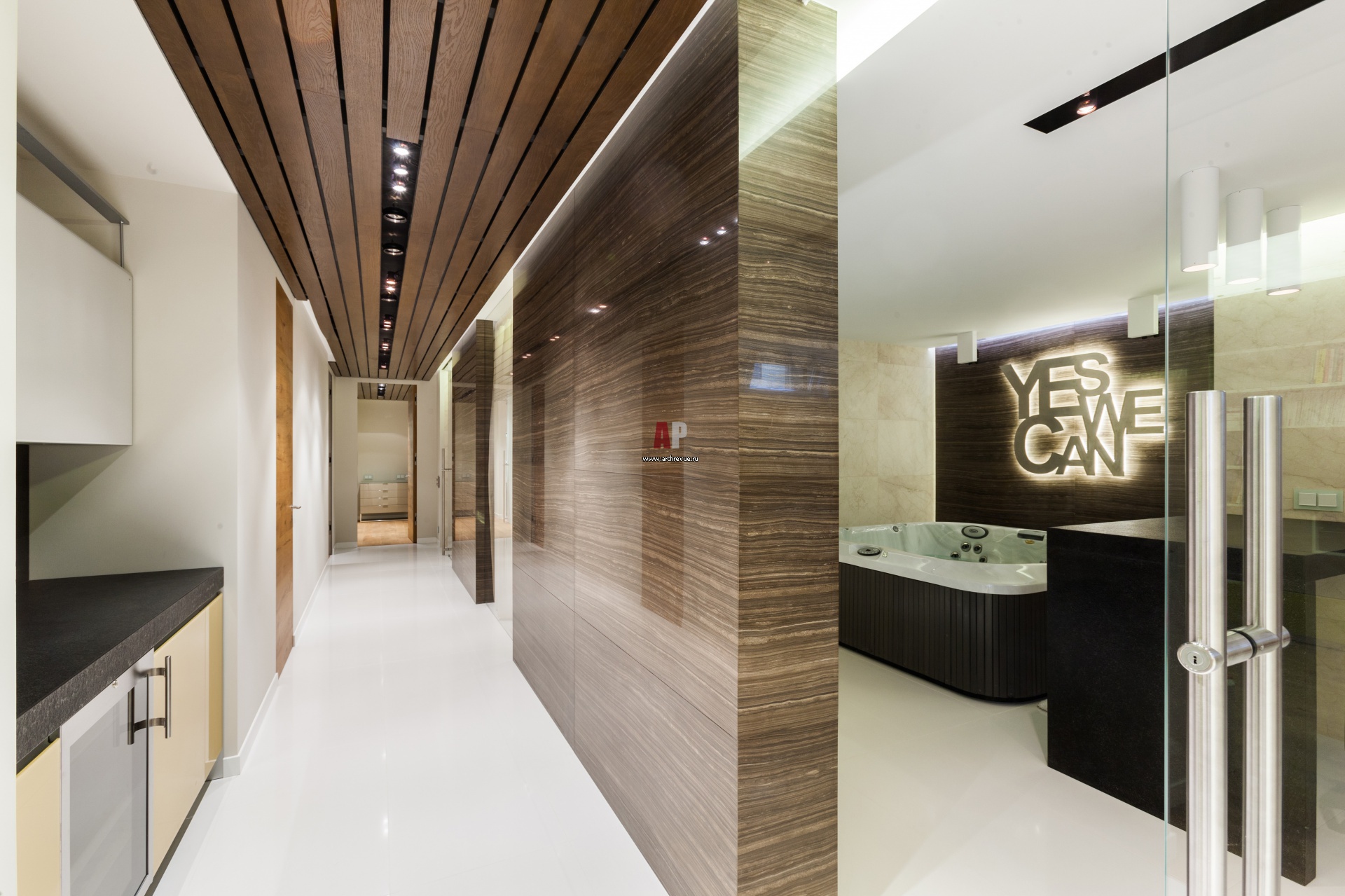 На нижнем уровне помимо спальни находится СПА-комплекс. Перегородка облицована полированным камнем, потолок подшит деревянными панелями.