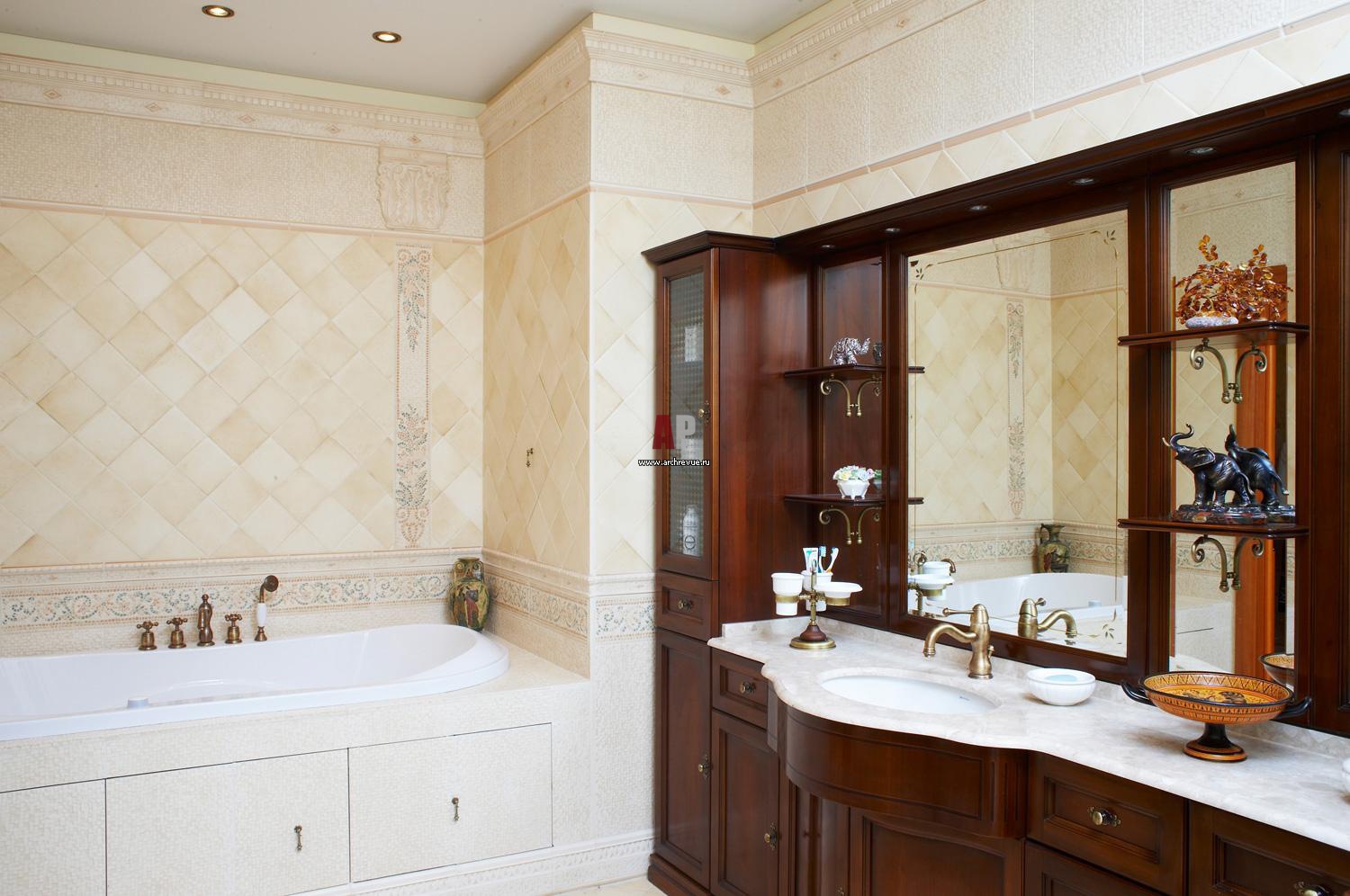 Основное пожелание заказчика – умывальник в классическом стиле. Его удалось найти в компании «Торговый Дом 7». Стены выложены плиткой и мозаикой цвета слоновой кости с цветочным рисунком.