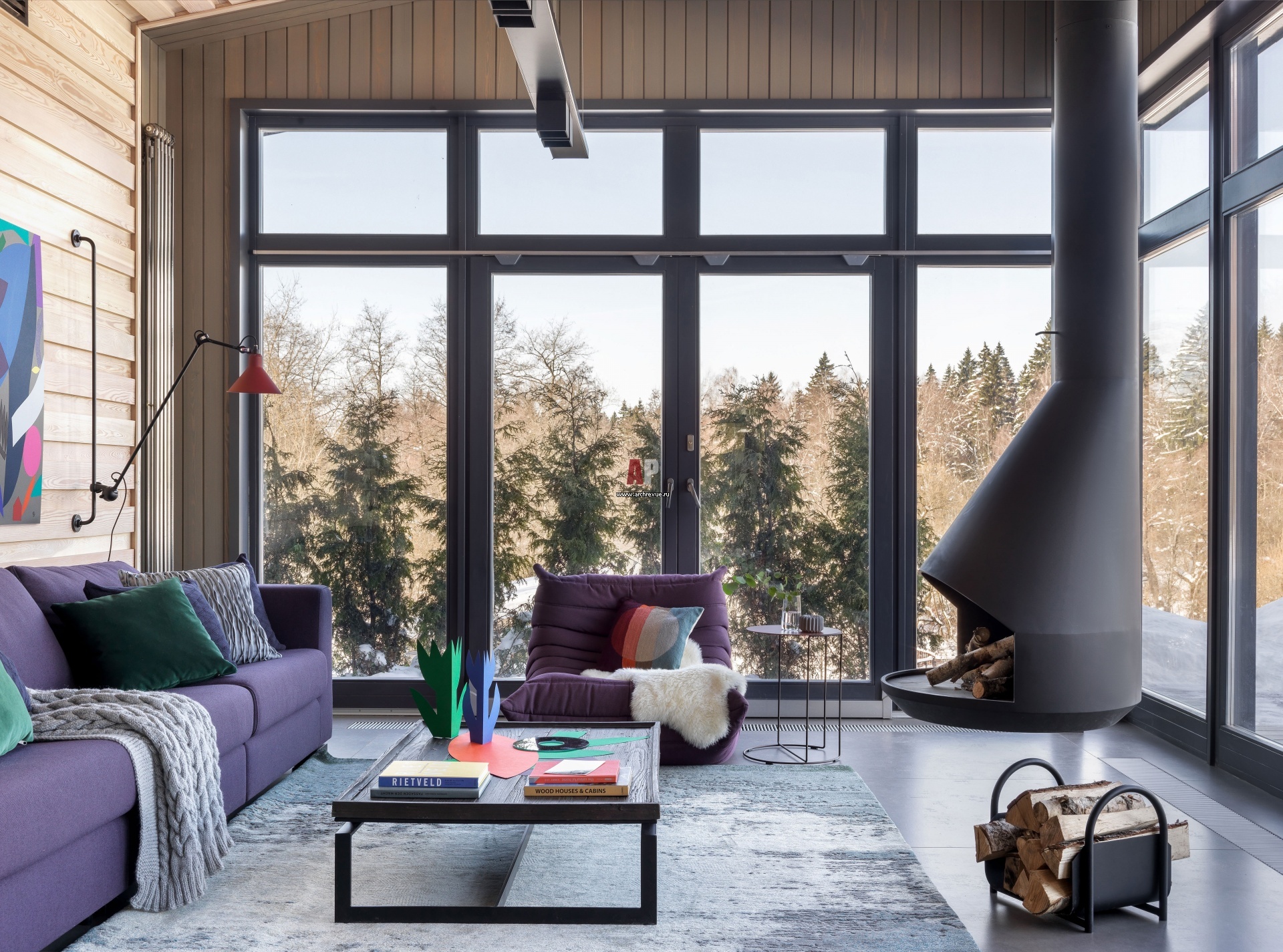 Гостиная в скандинавском стиле с подвесным камином Traforart из черного металла, эта модель не загораживает вид на природный пейзаж за окном.