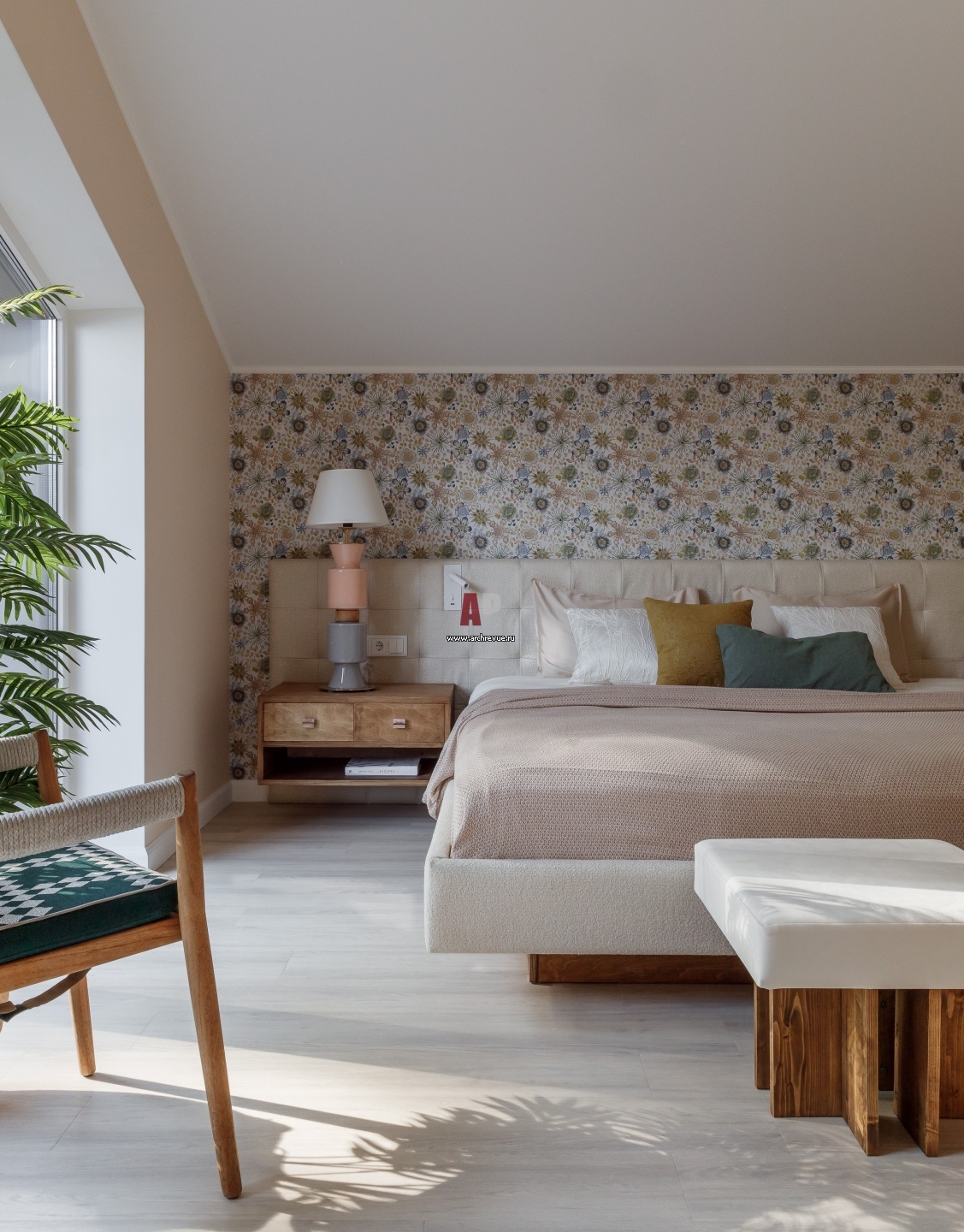 Дом в лесу. Хозяйская спальня с панорамным окном и видом на лес в мансарде.
