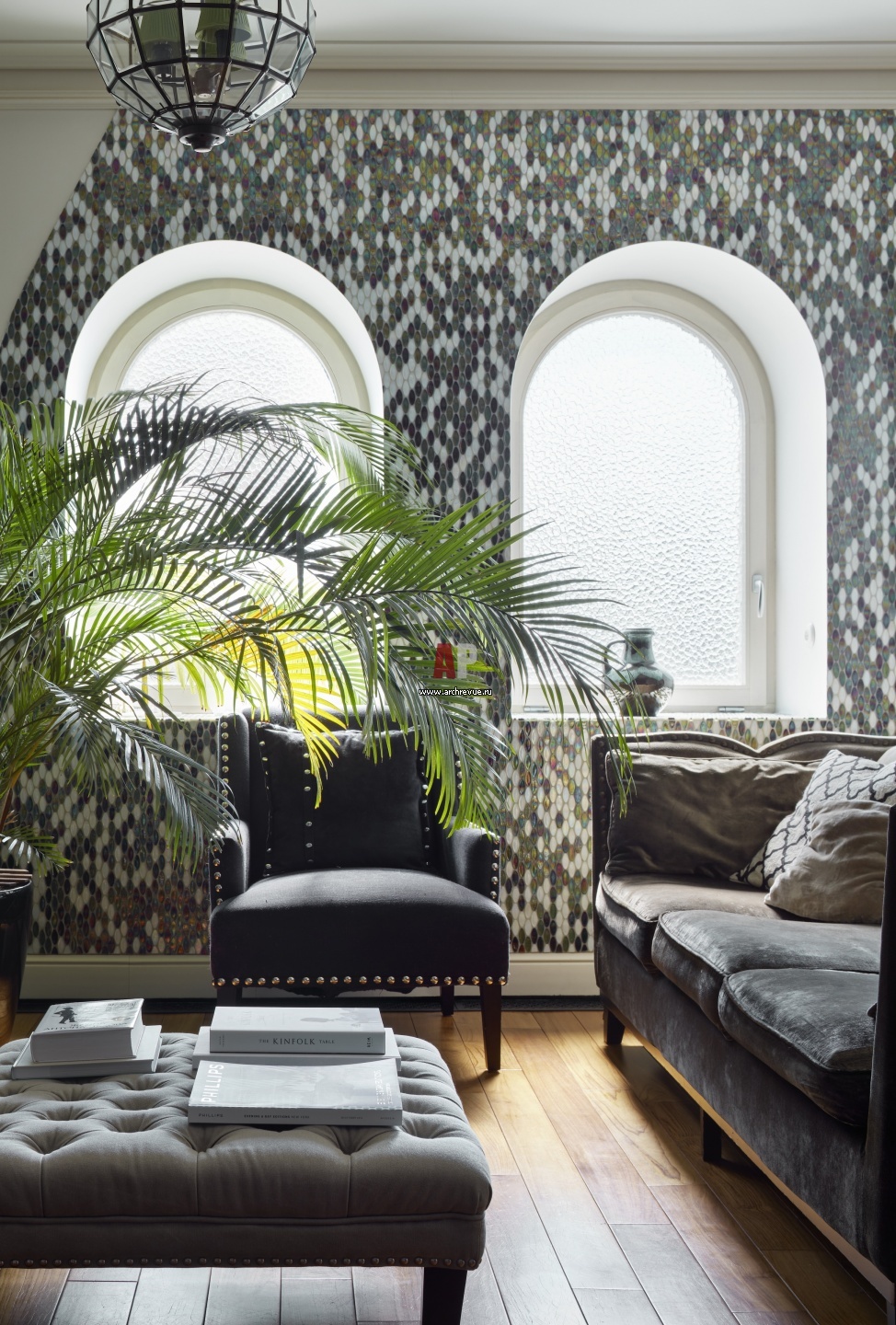 Украшение гостиной – три выстроенных в ряд арочных окна. Их архитектор объединила мозаикой Sicis в большую арку, которая напоминает марокканский витраж. Потолочные светильники, Eichholtz.