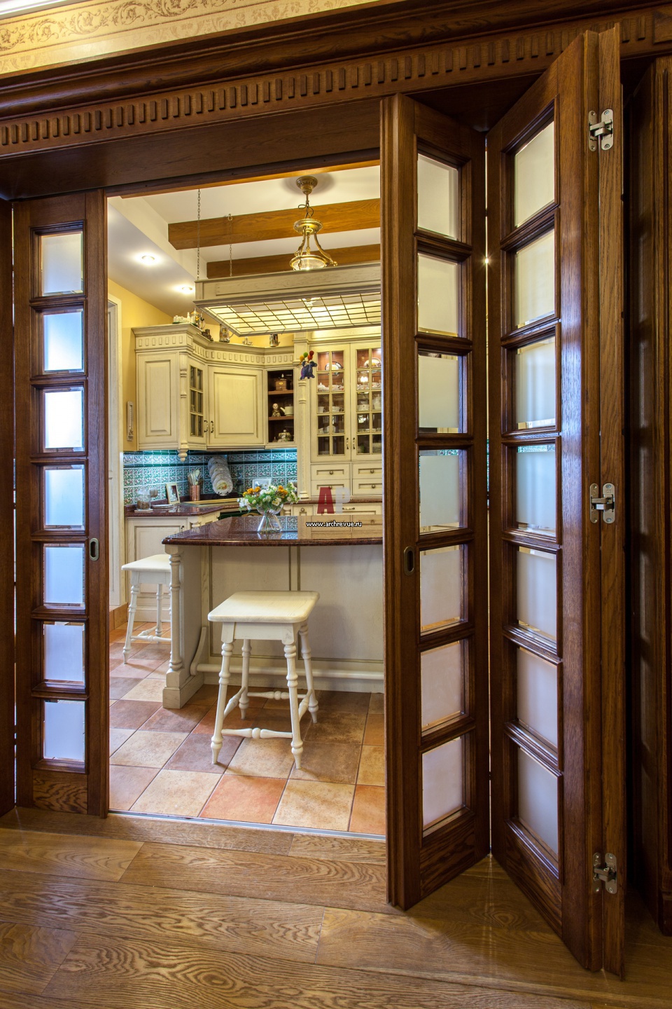 Кухня отделена от гостиной высокой раздвижной перегородкой-ширмой. Она выполнена на заказ из тонированного дуба с патиной и украшена фацетными стеклами.