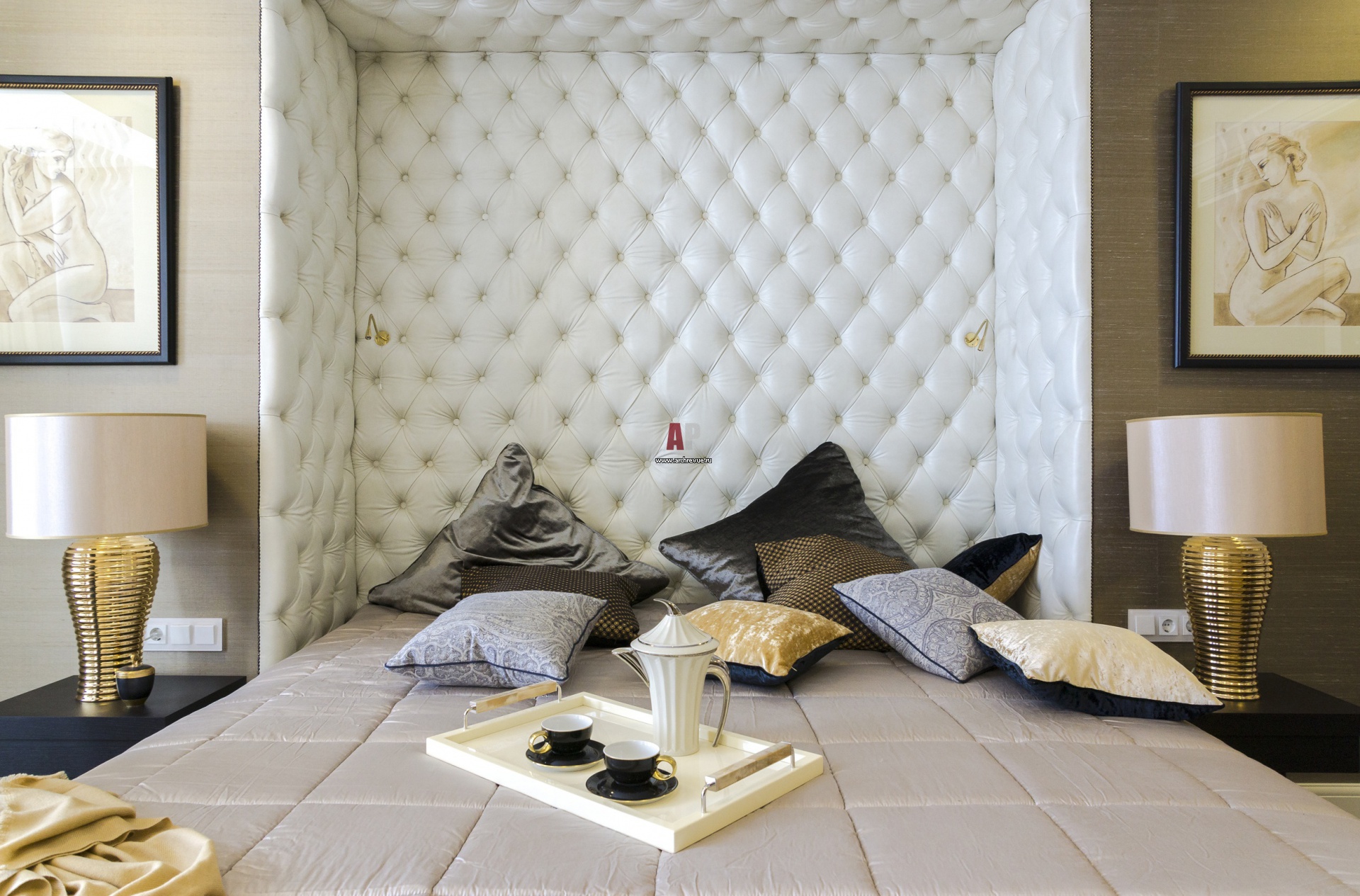 Кровать размещена в нише. Изголовье кровати выполнено на заказ. Прикроватные тумбочки, Meridiani, модель Clooney. Стены оформлены обоями с эффектом шелка. Настольные лампы, Zonca.