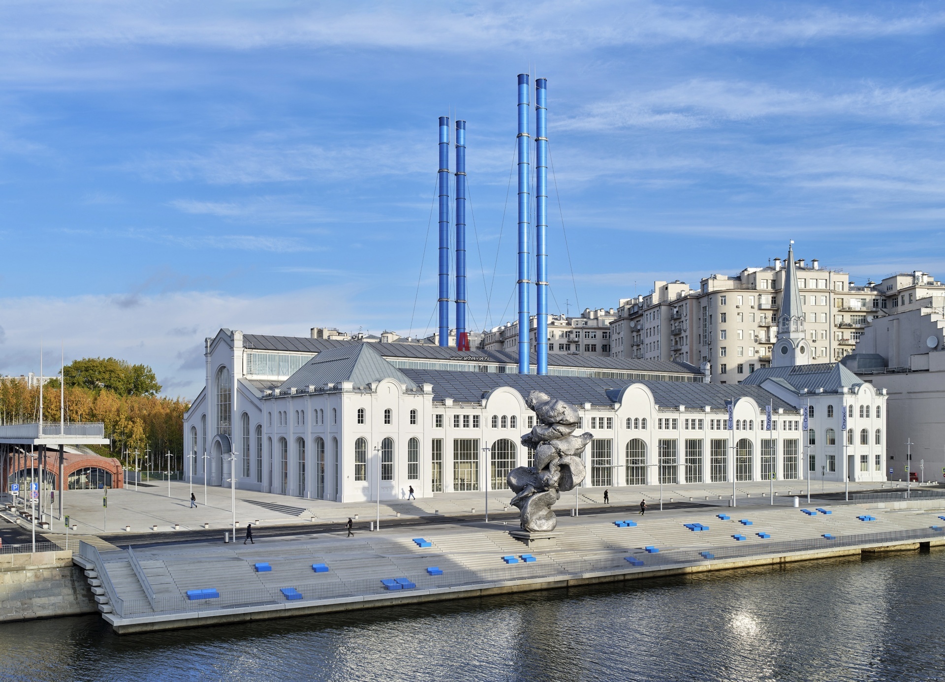 Дом культуры «ГЭС-2». Главный фасад. Кровля в технике фальца, материал: серо-голубой титан-цинк, серо-голубой титан-цинк Rheinzink, покрытие prePATINA Blaugrau. Элементы фасада, парапеты из титан-цинка, Rheinzink.