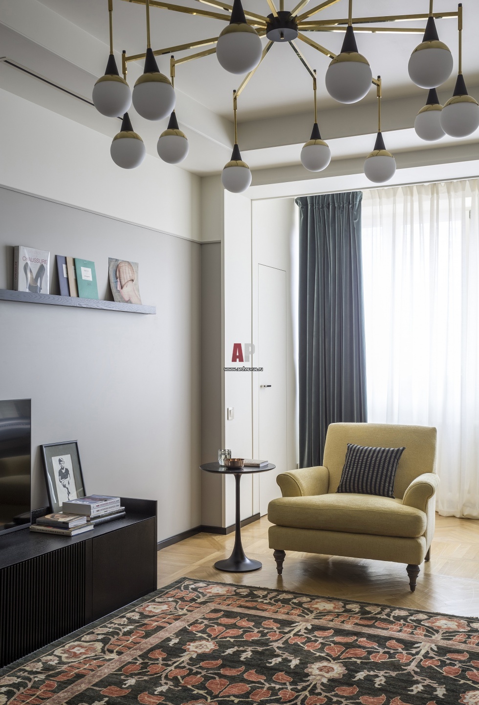 Интерьер современной гостиной в холодных тонах. Дверь-невидимка ведет в техническое помещение, где расположены климатические блоки, вентилирующие всю квартиру.
