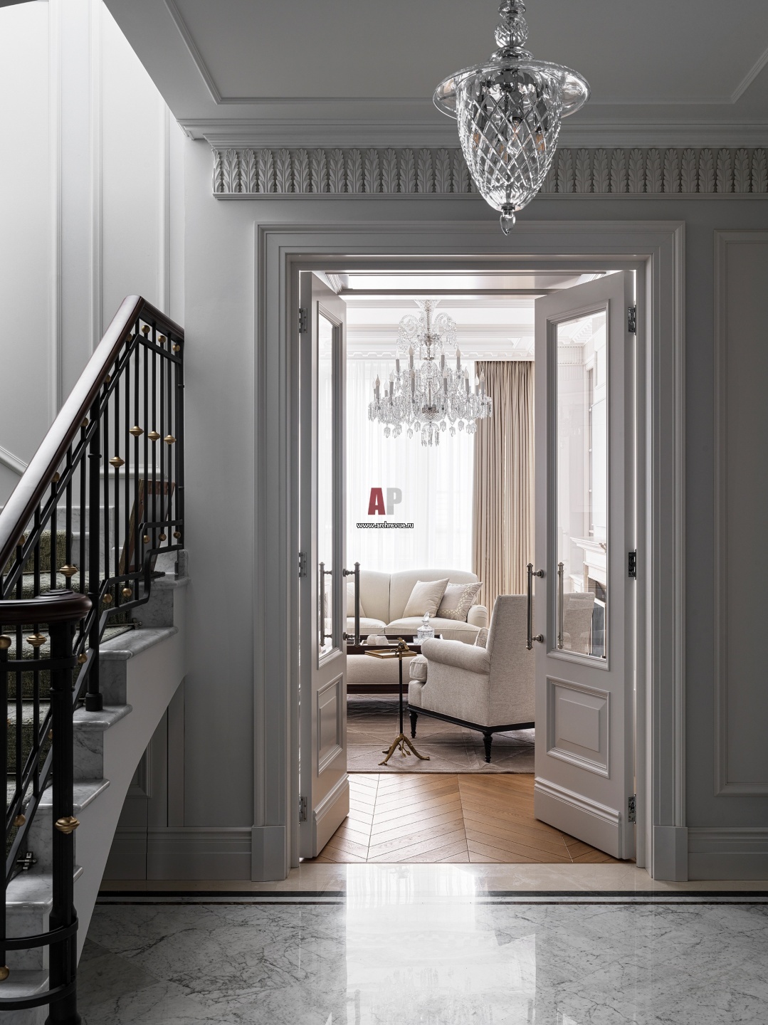 Двухэтажная квартира с террасой в стиле неоклассика. Прихожая. На полу – мраморная плитка.