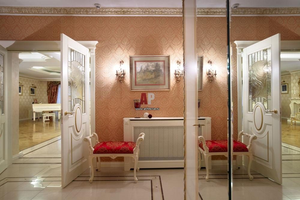 Оформляя холлы дома, автор использует более сочные оттенки обоев на стенах. Они прекрасно сочетаются со светлой мебелью, выбеленными коваными ограждениями лестниц, мрамором и молочным цветом дверей и порталов. Двери, лестницы по эскизам архитектора, исполнитель «Евростоун»