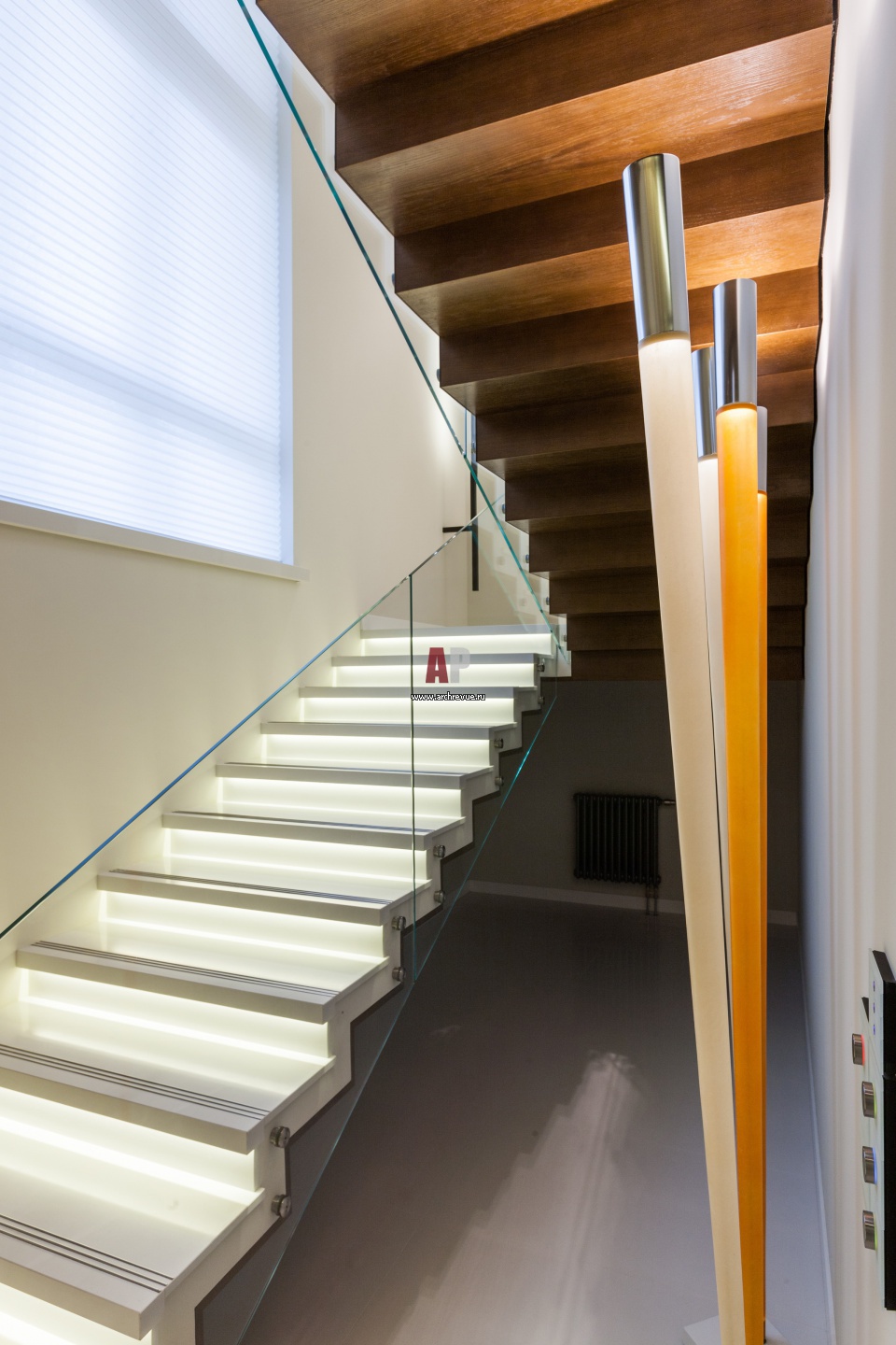 Лестница выглядит легкой и воздушной за счет светлого камня в отделке, подсветки подступенков и ограждения из стекла. Торшеры, Viabizzuno.